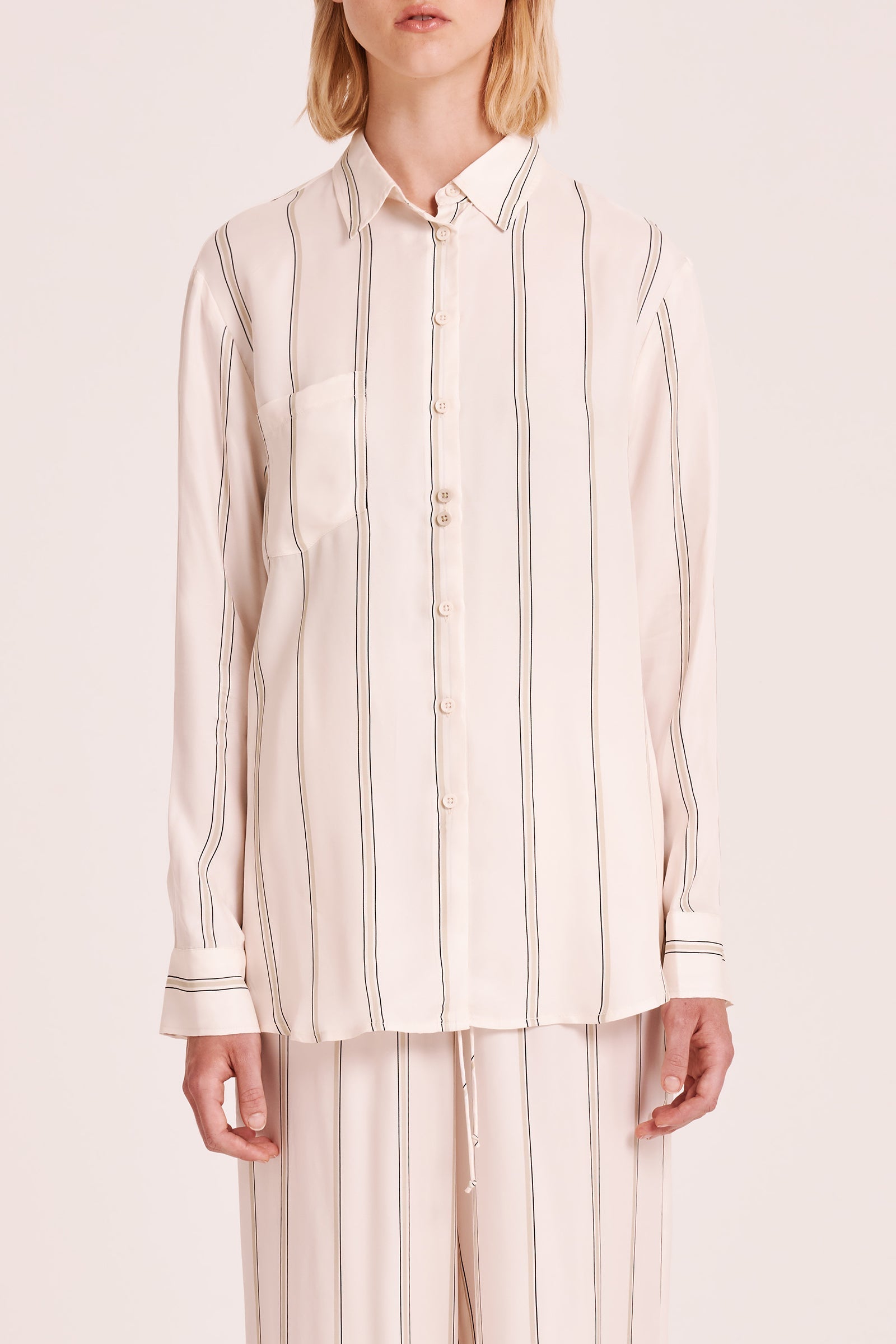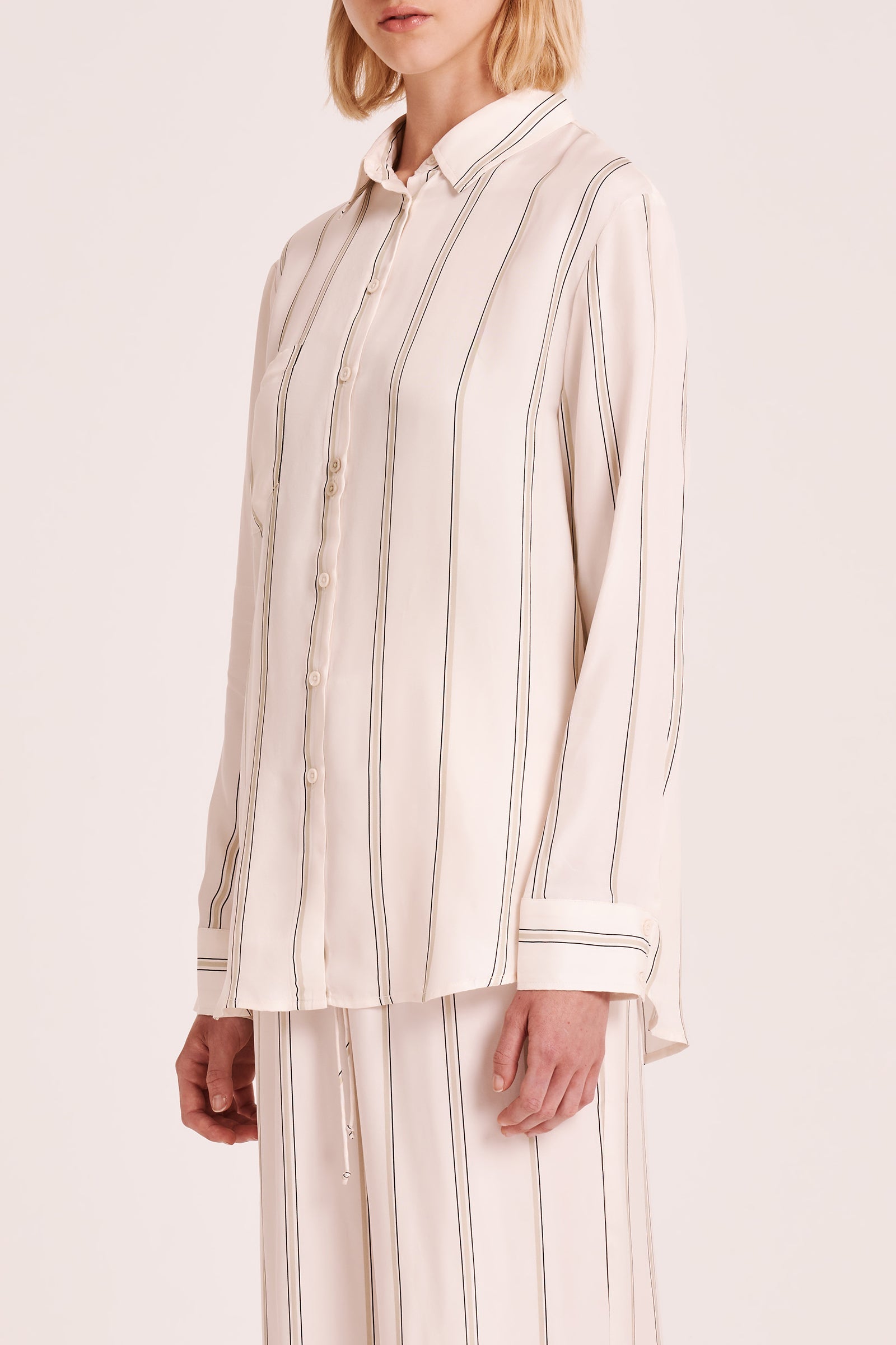 The Noosha Cupro LS Shirt is made in our signature cupro fabrication in our exclusive Paloma print. The silhouette is relaxed and oversized through the body with the length finishing below the hips. Features include classic shirt detailing with front patch pocket and contrast button detail. Wear it open as a soft jacket or layering piece.