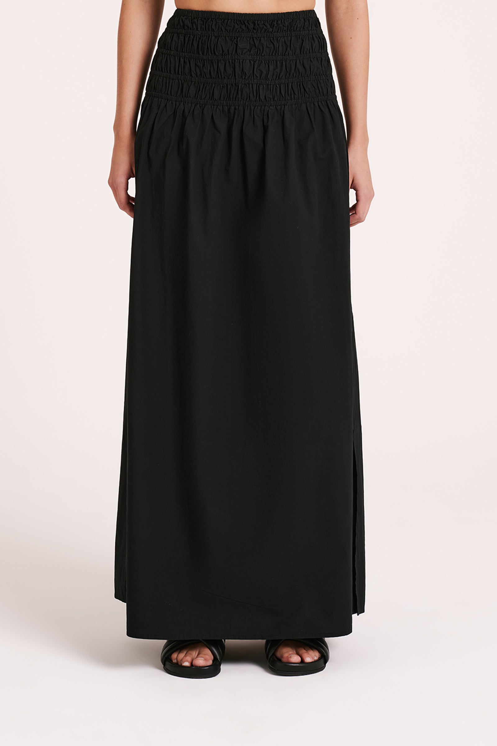 The Oasis Poplin Maxi Skirt in black is made from 100% cotton poplin which has a crisp hand feel. The silhouette is worn high on the waist and is fitted to the hips with a full skirt finishing above the ankle. Features include elasticated gathering from the waist to the hips and side seam slits at hem.