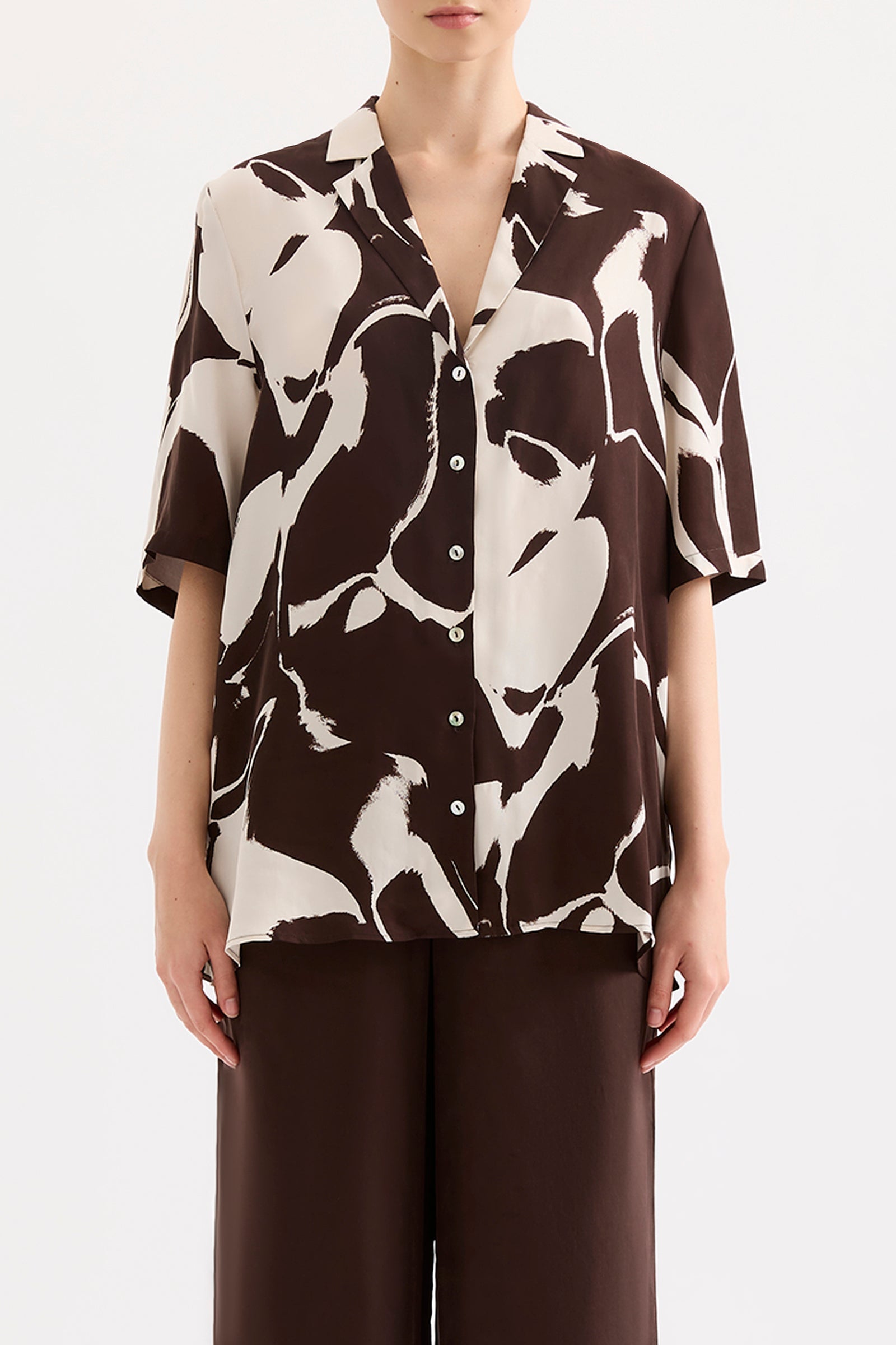 The Ombra Cupro Shirt is made in our signature cupro fabrication in our exclusive Ombra print. The silhouette is an oversized fit, with length finishing at the hip. Features include classic shirting details with back yoke and shell buttons.