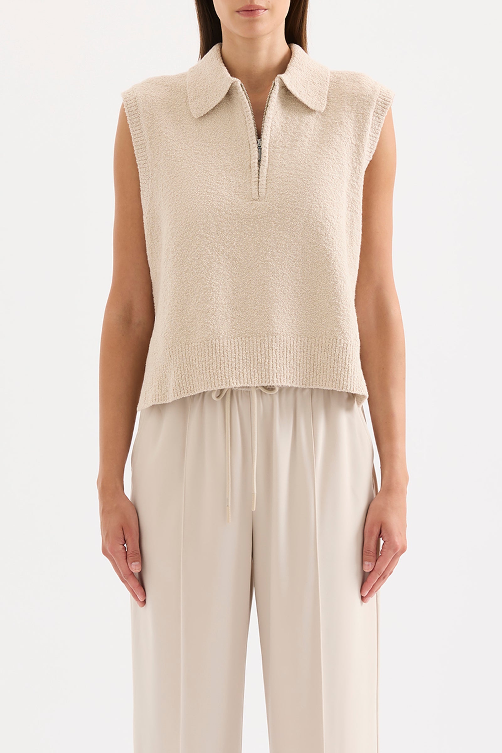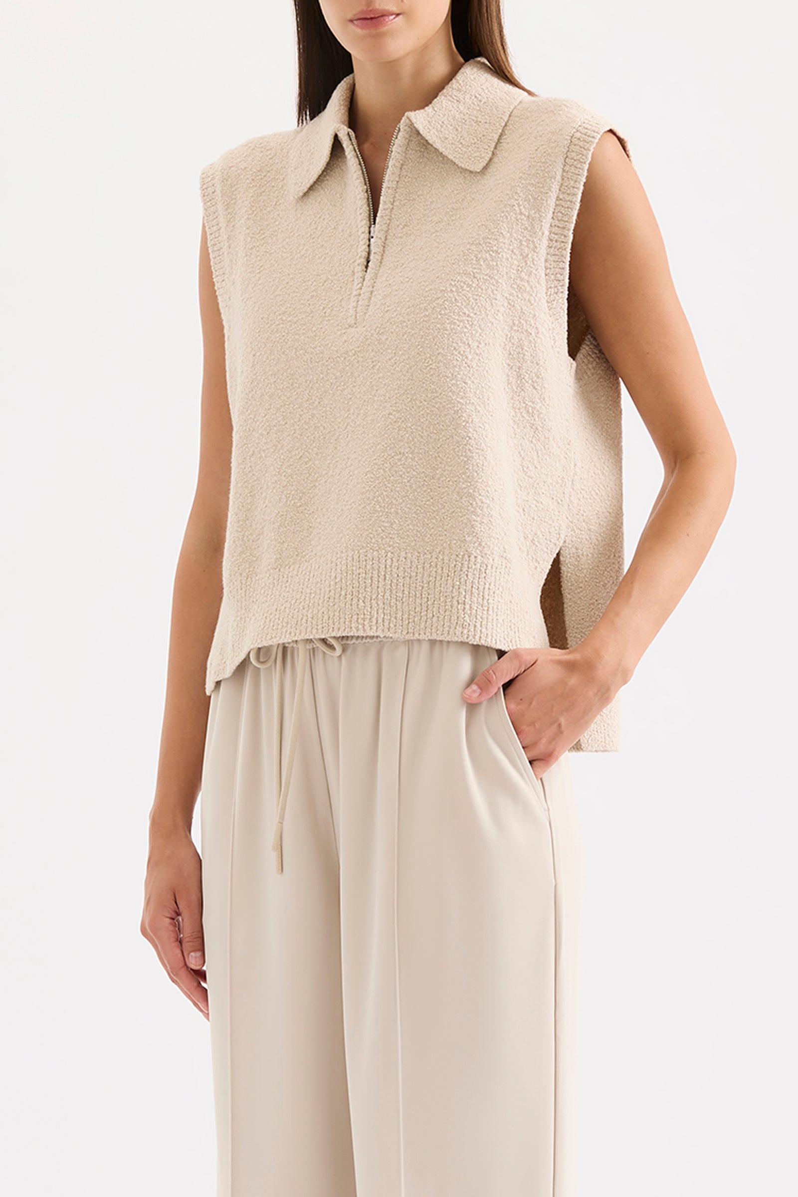 The Ordell Knit Vest is made from a cotton blend textured boucle yarn with a dry and cool handfeel. The silhouette is relaxed finishing at the hips. Features include a fully knitted rugby collar, with a branded exposed zipper opening at front chest and a ribbed stepped hem with side slits.
