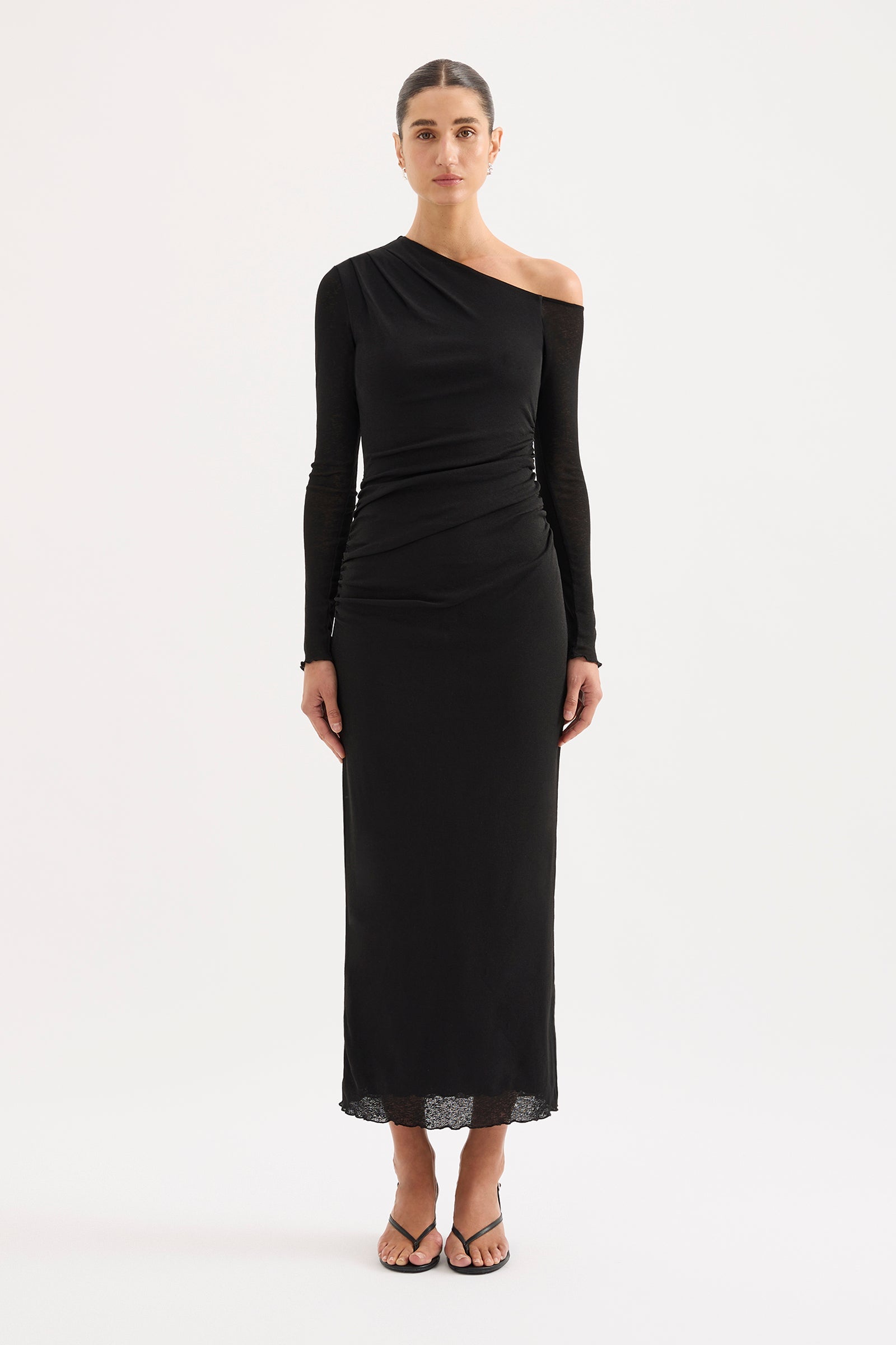 The Orelia LS Maxi Dress is made from a stretch jersey which has a dry hand feel. The silhouette is form fitting with long sleeves and length finishing above the ankles. Features include an asymmetric neckline, rouching detail on waist and slit at centre back. This dress is fully lined.