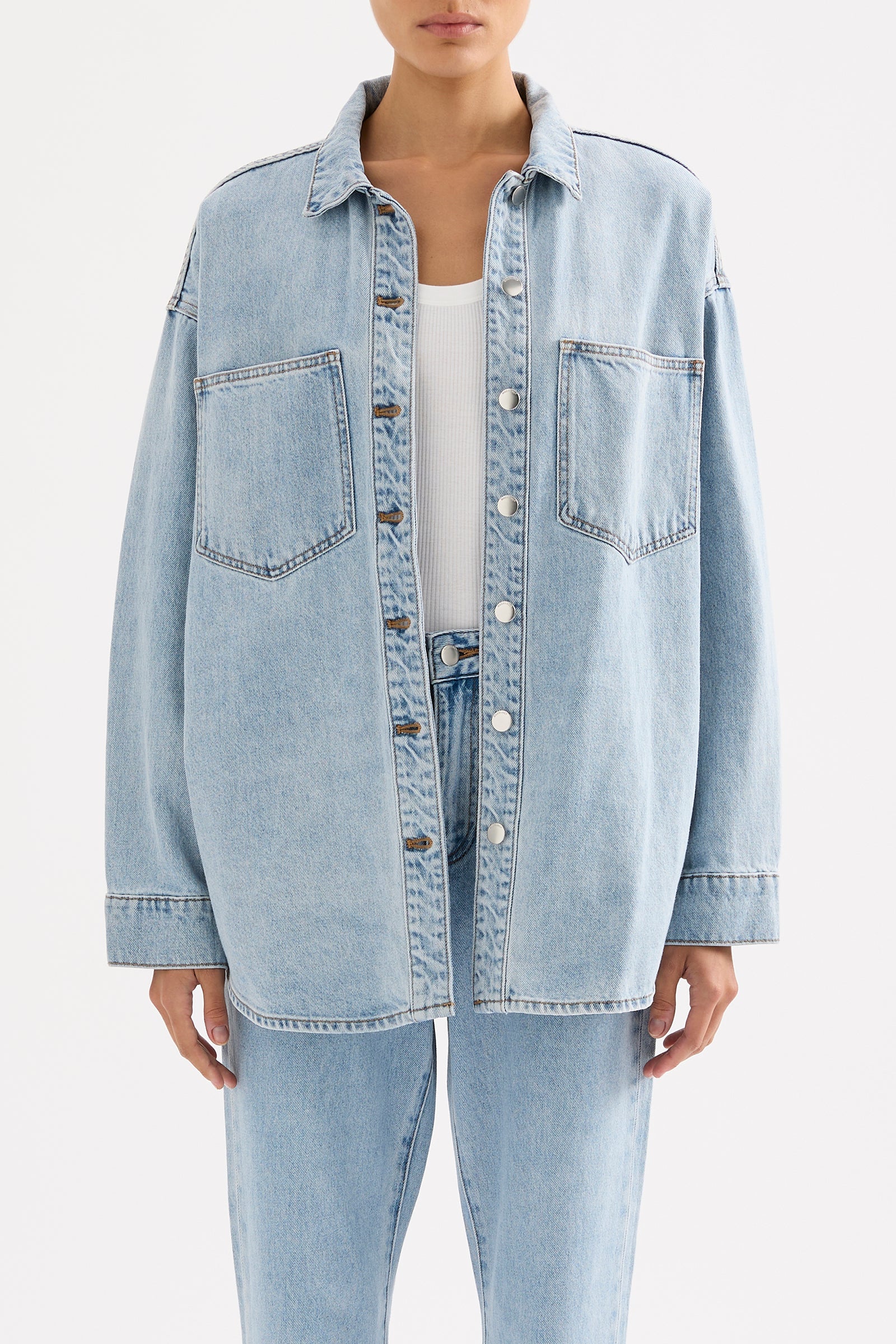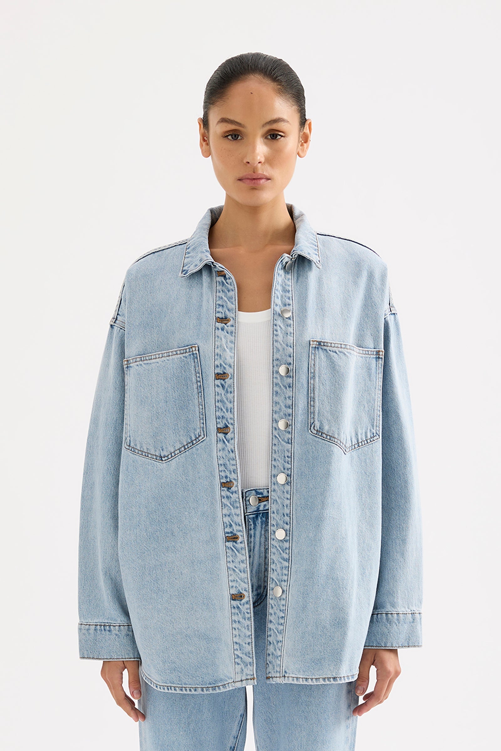 The Organic Denim Overshirt is made from 8 oz 100% organic cotton denim, stone washed to an authentic stone wash in 90s blue. The silhouette is oversized with a drop shoulder and length finishing below the hips. Features include front patch pockets & branded shank button through centre and sleeve cuff.