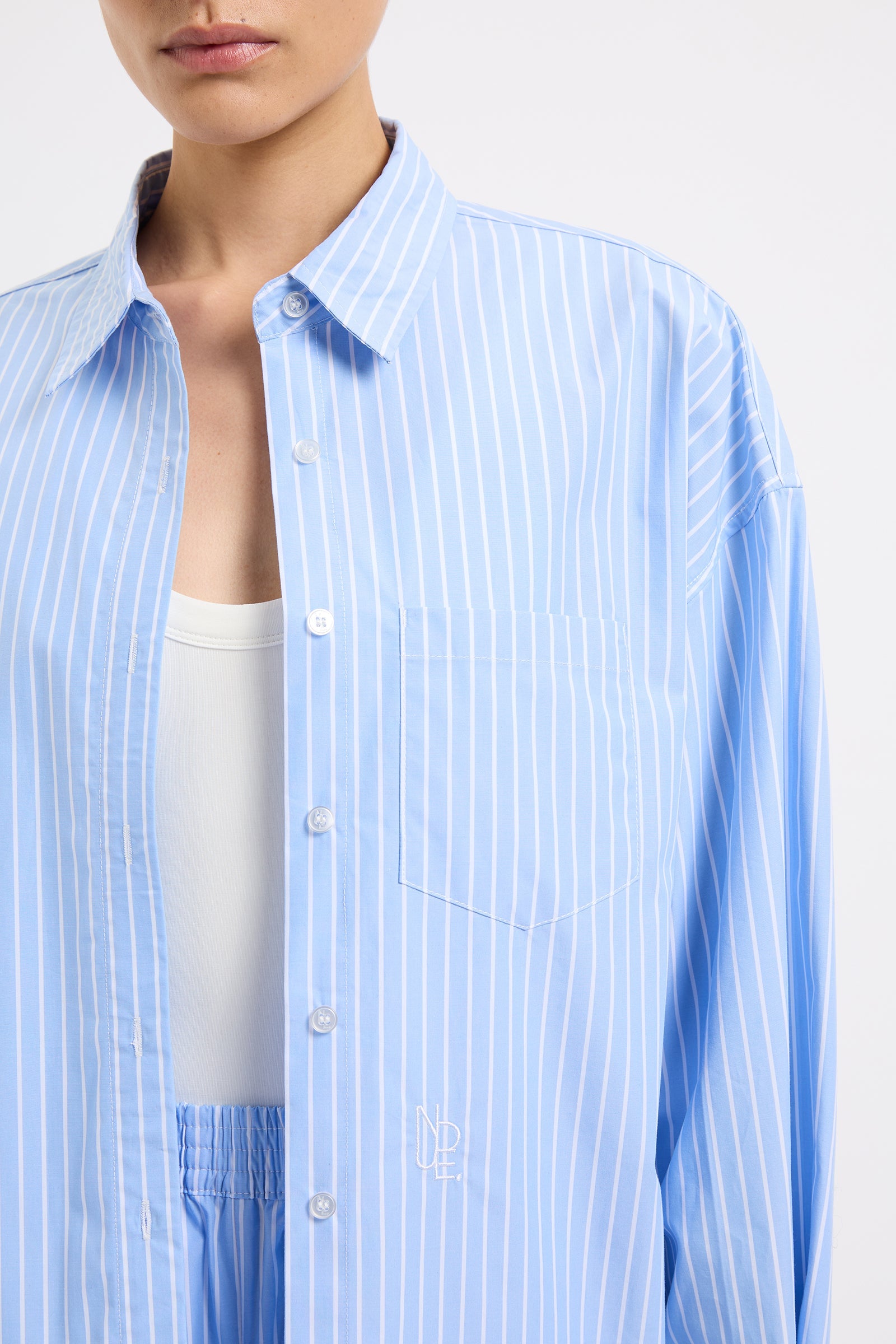 The Organic Poplin Shirt is made from a organic cotton poplin which has be washed for a smooth, crisp hand feel. The silhouette is oversized throughout with length finishing on the hips. Features include front patch pockets, a large cuff and Nude Lucy branded buttons.