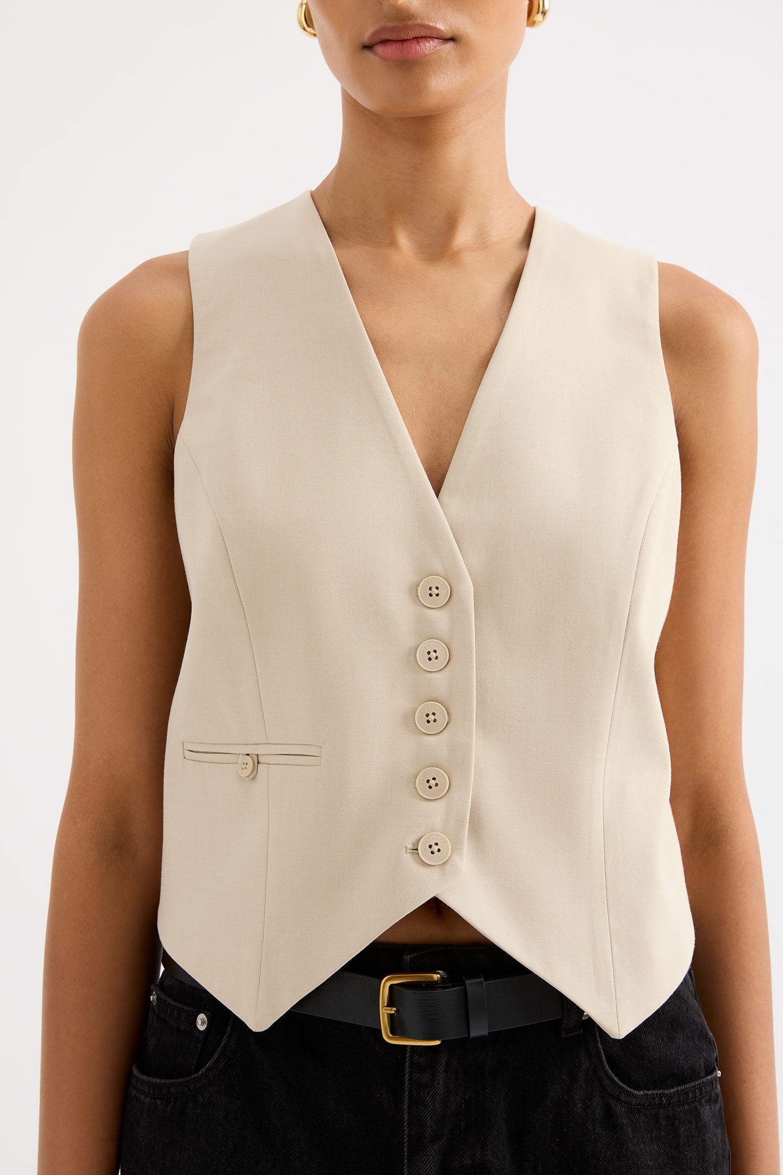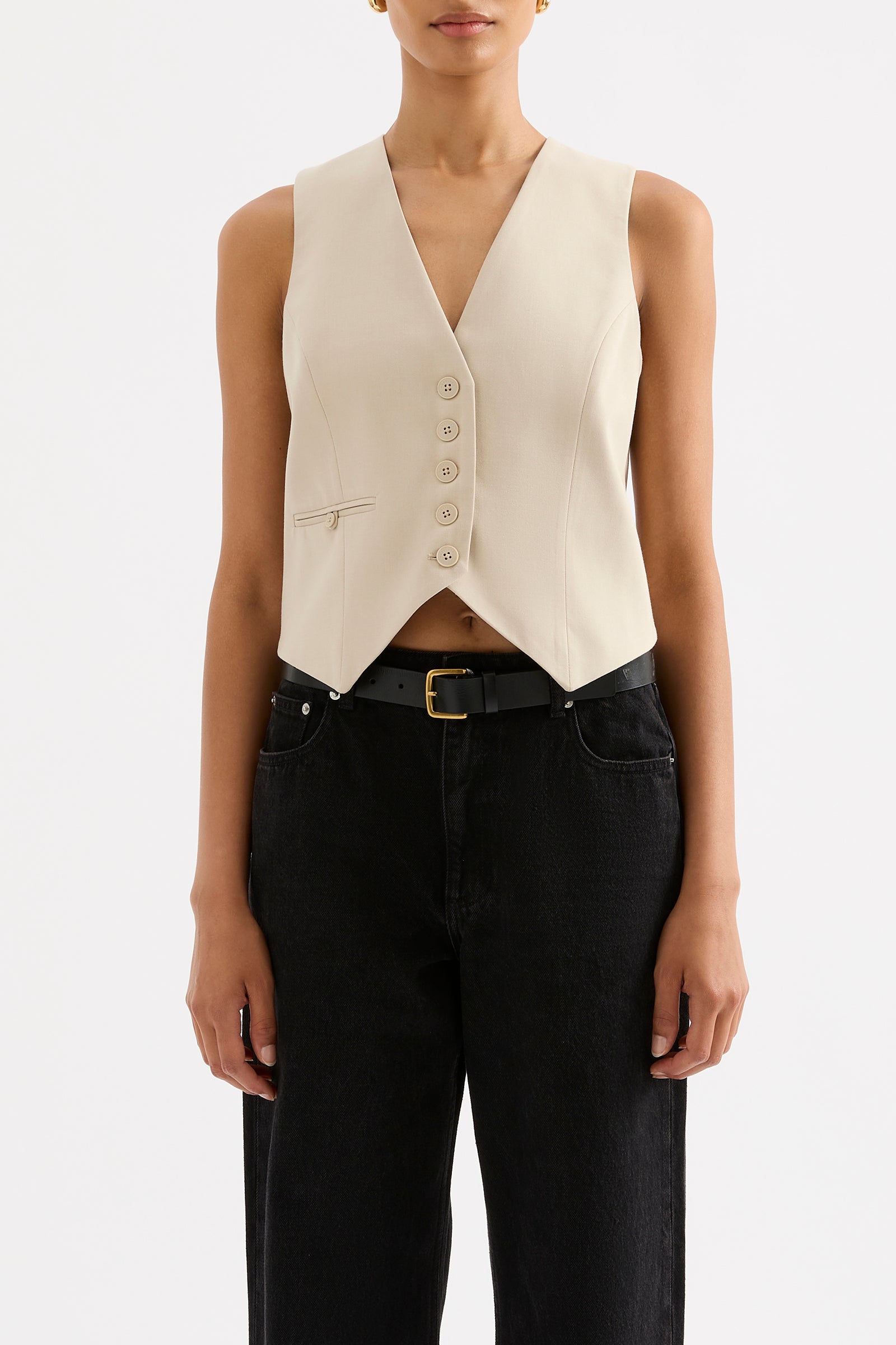 The Orla Vest is made from a classic wool blend suiting fabrication with a smooth hand feel. The silhouette is tailored and slim fitting with a button front opening. Features include a v neck, jetted pocket , branded buttons and adjustable back ties. The Orla Vest is fully lined.