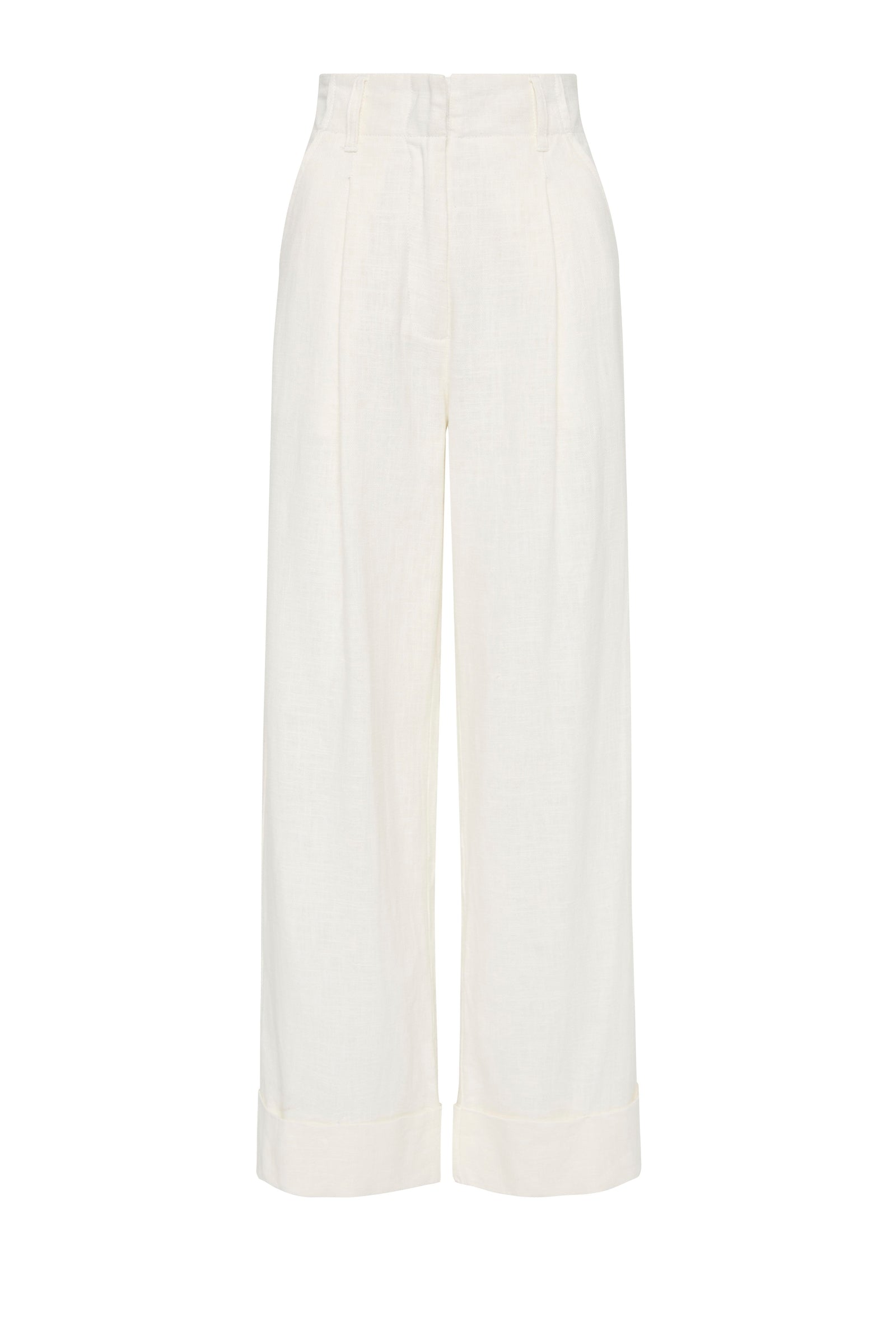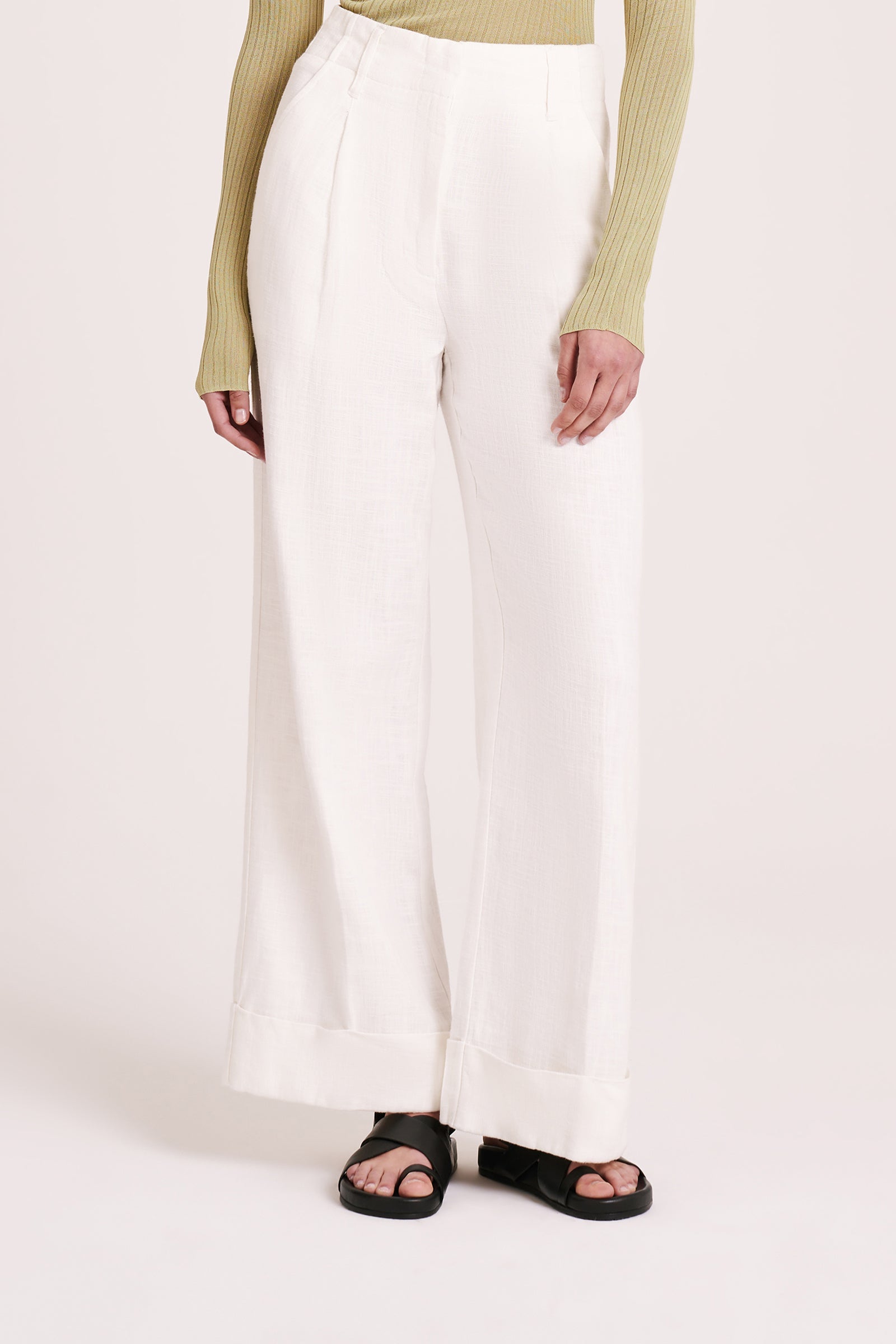 The Paloma Tailored Pant is made from a premium heavy weight ramee blend fabrication. The silhouette is a classic tailored fit with a high waist, wide legs and length finishing full length. Features include a functioning fly front with a fitted waistband, front pleats at waist, belt loops and side seam pockets.
