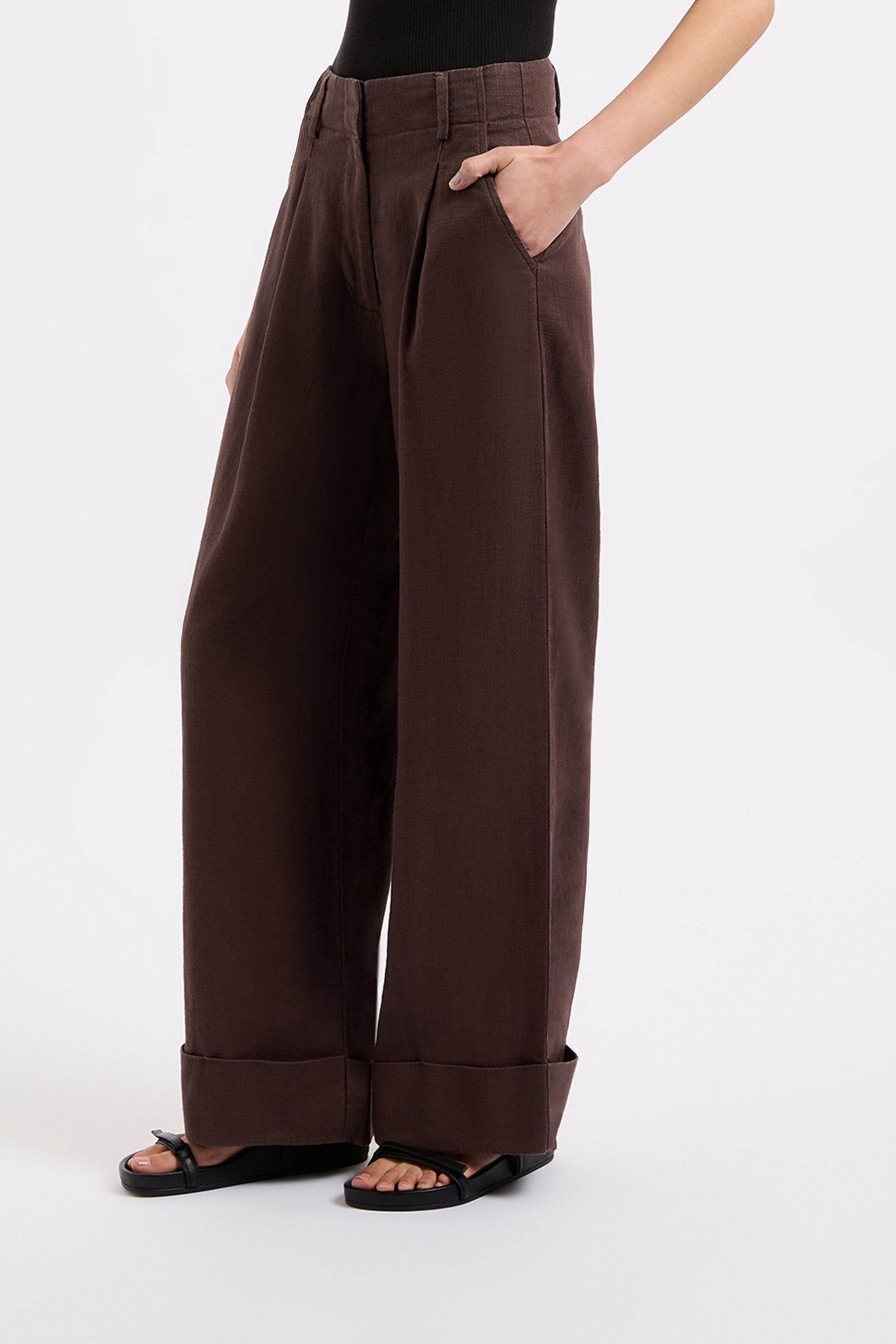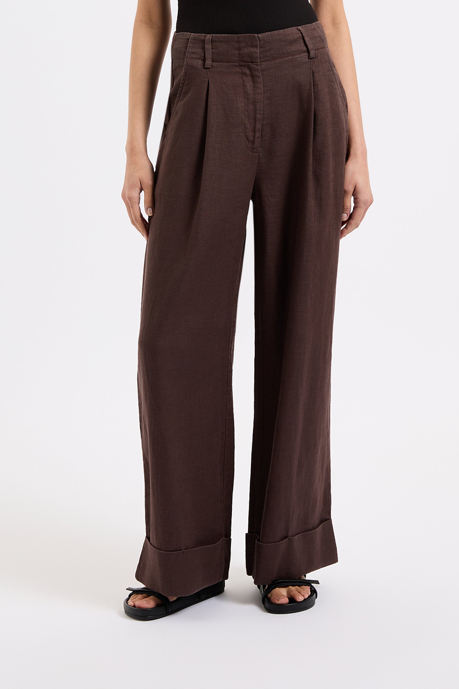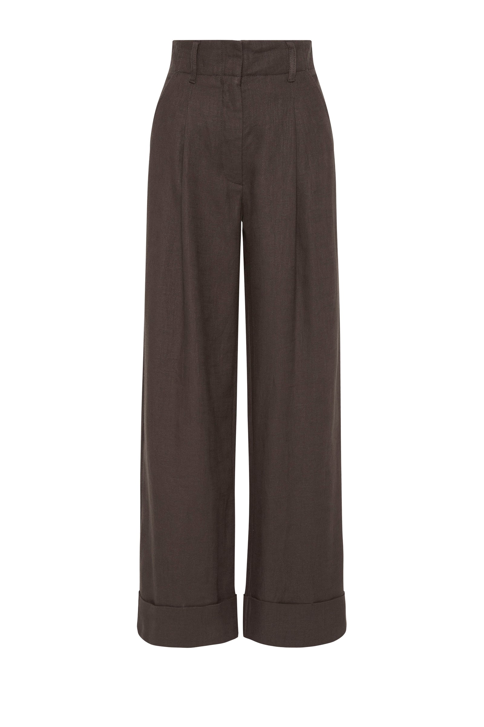 The Paloma Tailored Pant is made from a premium heavy weight ramee blend fabrication. The silhouette is a classic tailored fit with a high waist, wide legs and length finishing full length. Features include a functioning fly front with a fitted waistband, front pleats at waist, belt loops and side seam pockets.