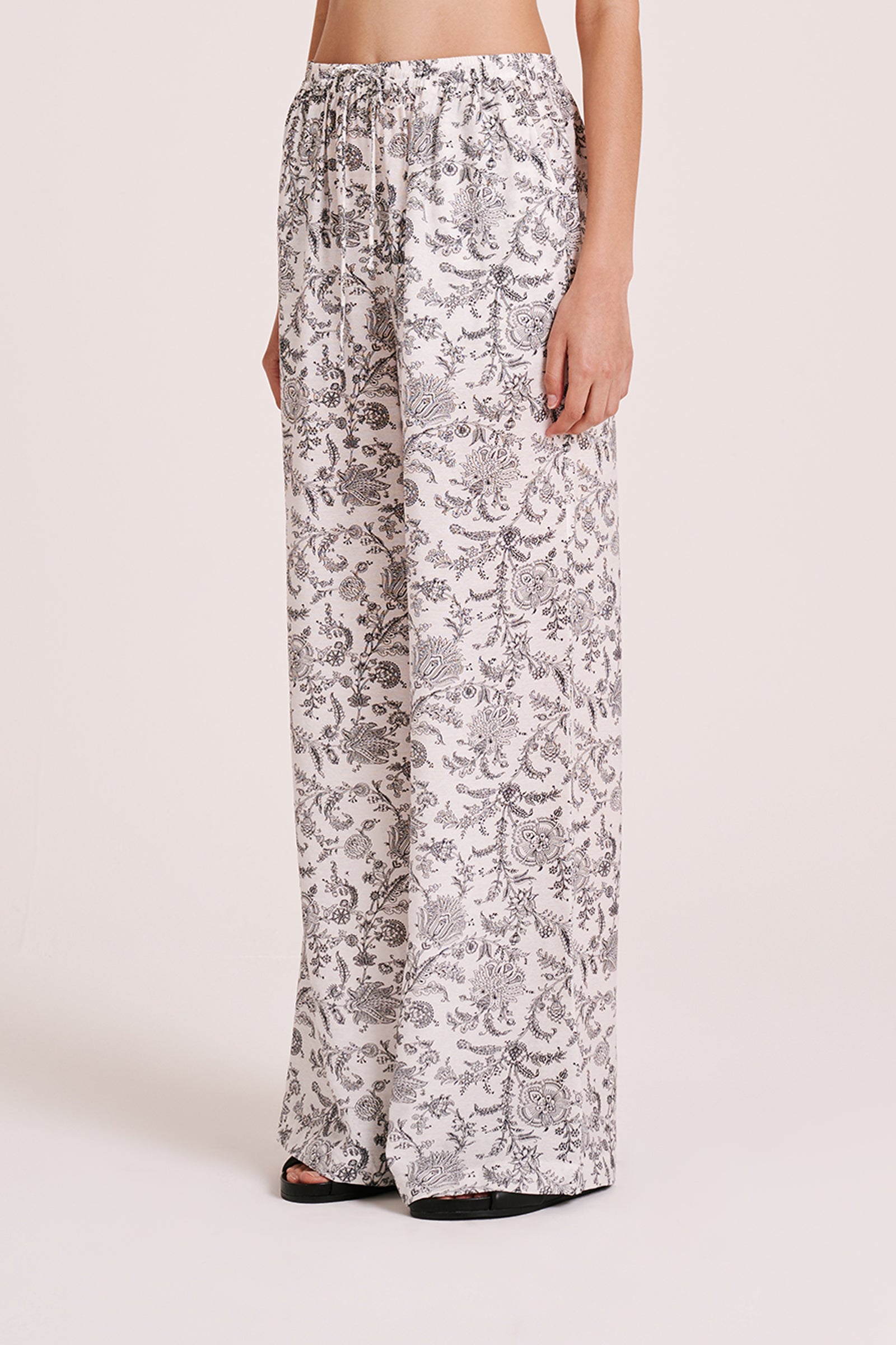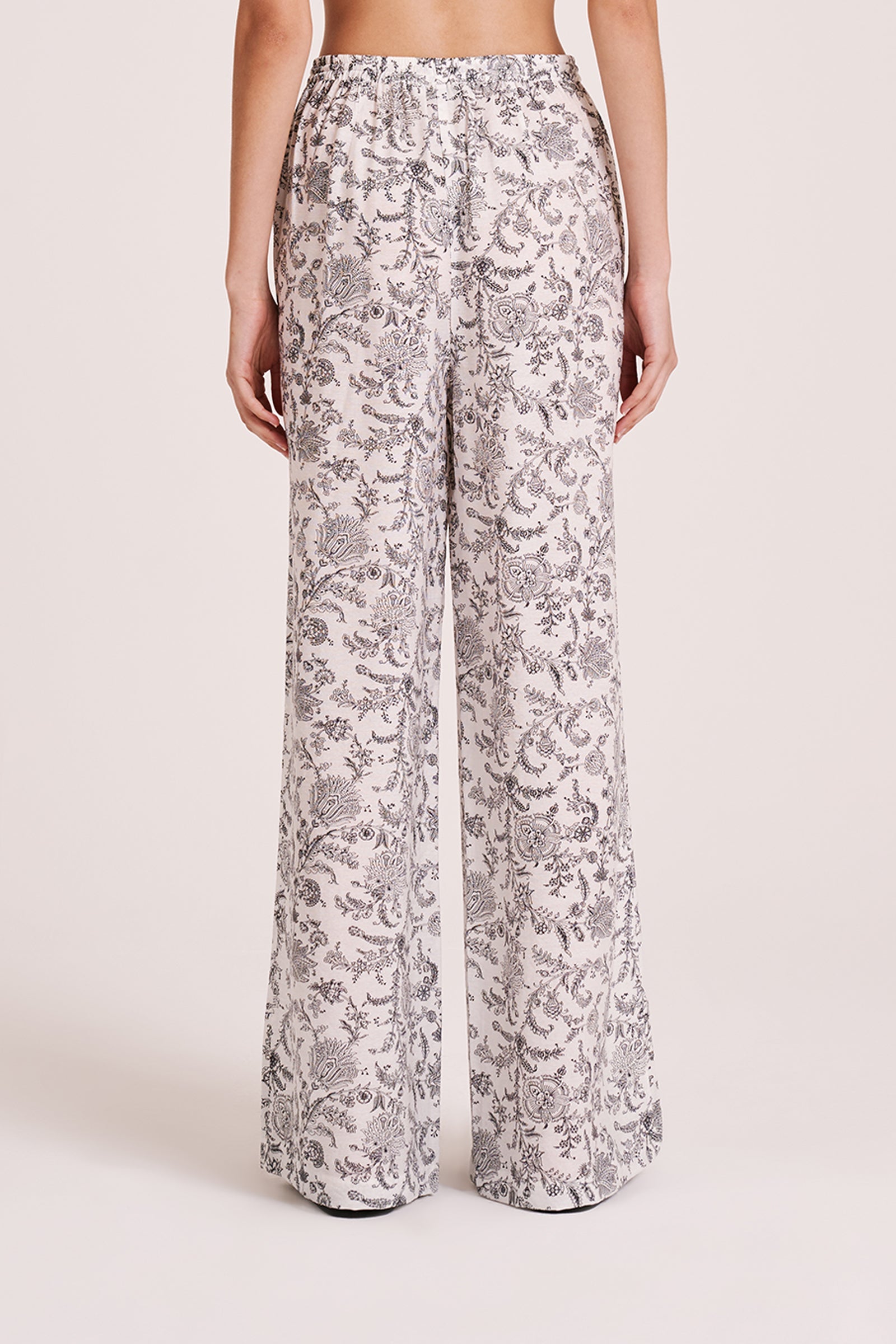 The Paz Pant is made from a lightweight rayon blend fabric in our exclusive Rhapsody print. The silhouette is a relaxed wide leg, full length pant. Features include a an elasticated waistband with a drawstring tie, side seam pockets and two back patch pockets.