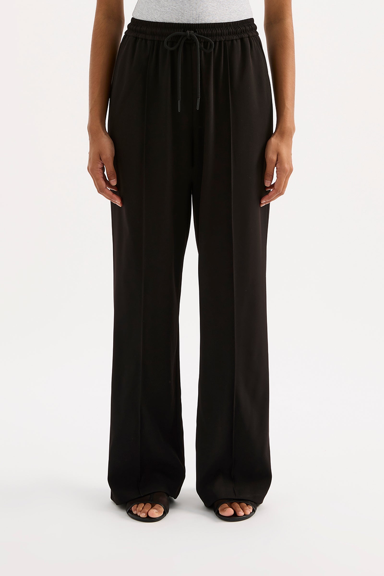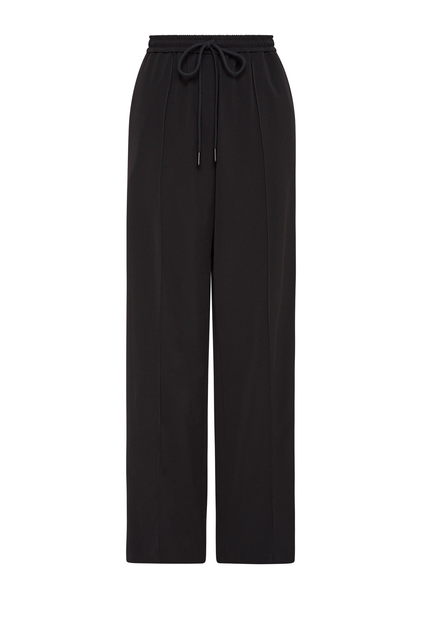The Quincy Pant is made from a lightweight tailoring fabric. The silhouette is relaxed with a wide full length leg. Features include an elasticated waistband with an external draw cord, pin stitch down the centre of the legs, and side seam pockets.