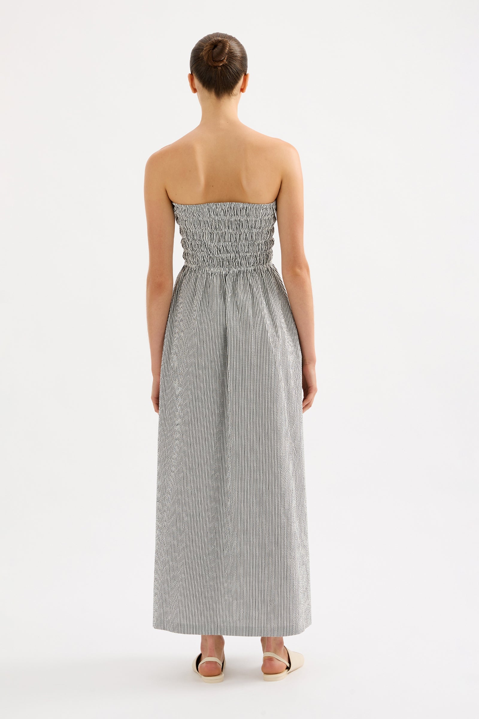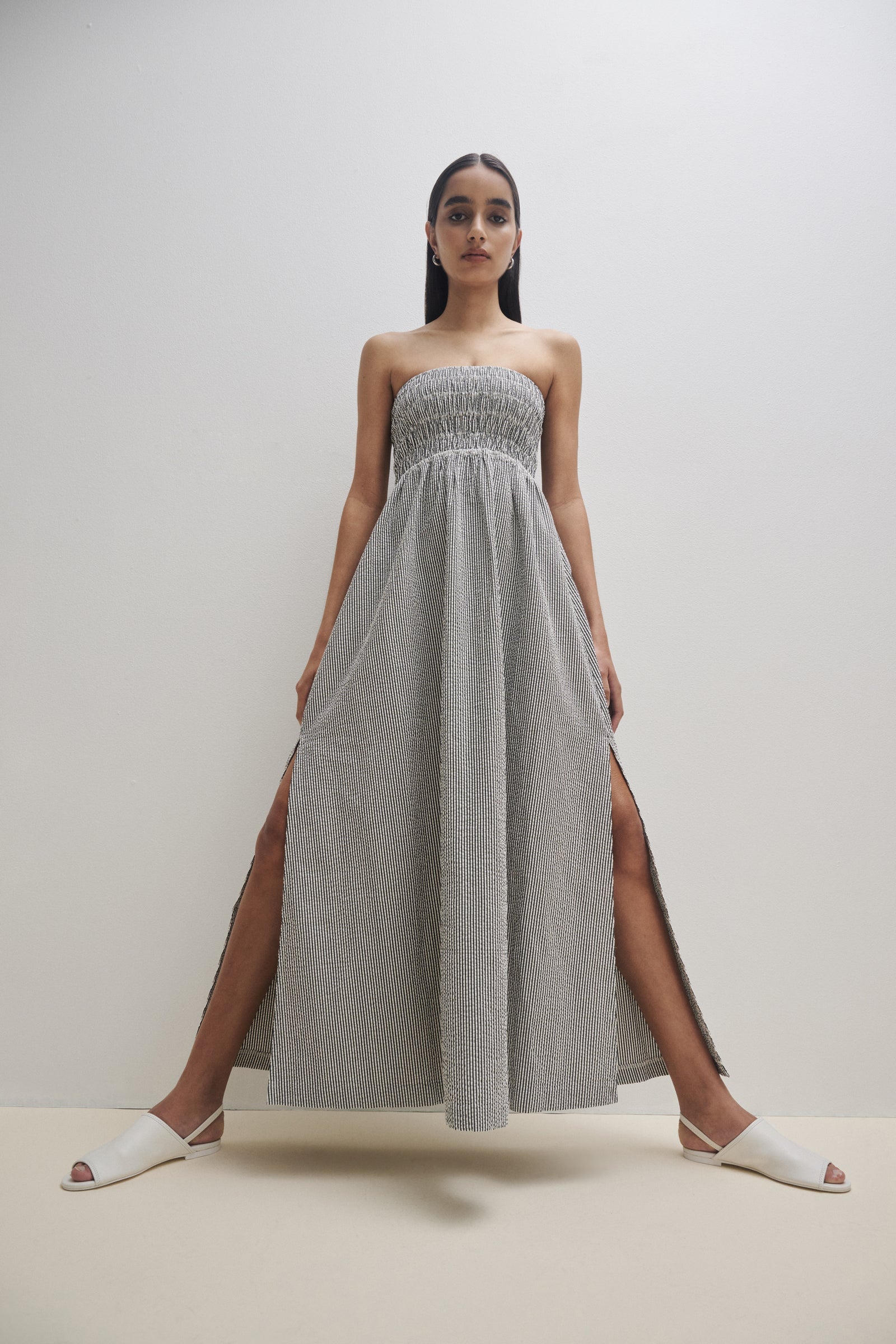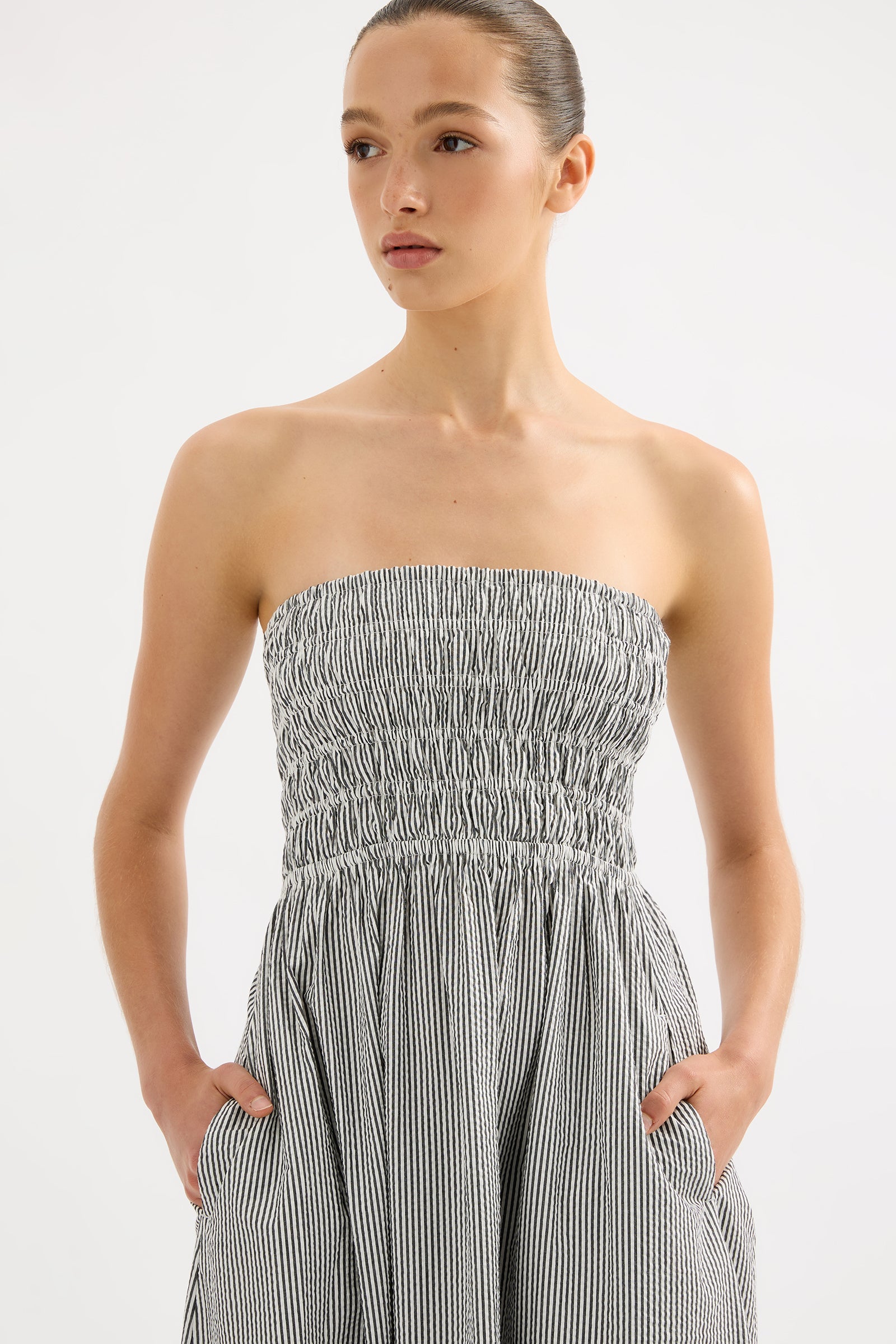The Quinn Maxi Dress is made from a cotton seersucker fabrication which has a soft textured look and hand feel. The silhouette is feminine and relaxed with a strapless, shirred elasticated bodice and soft billowing skirt that finishes above the ankle. Features include side seam pocket and side splits at the hem.