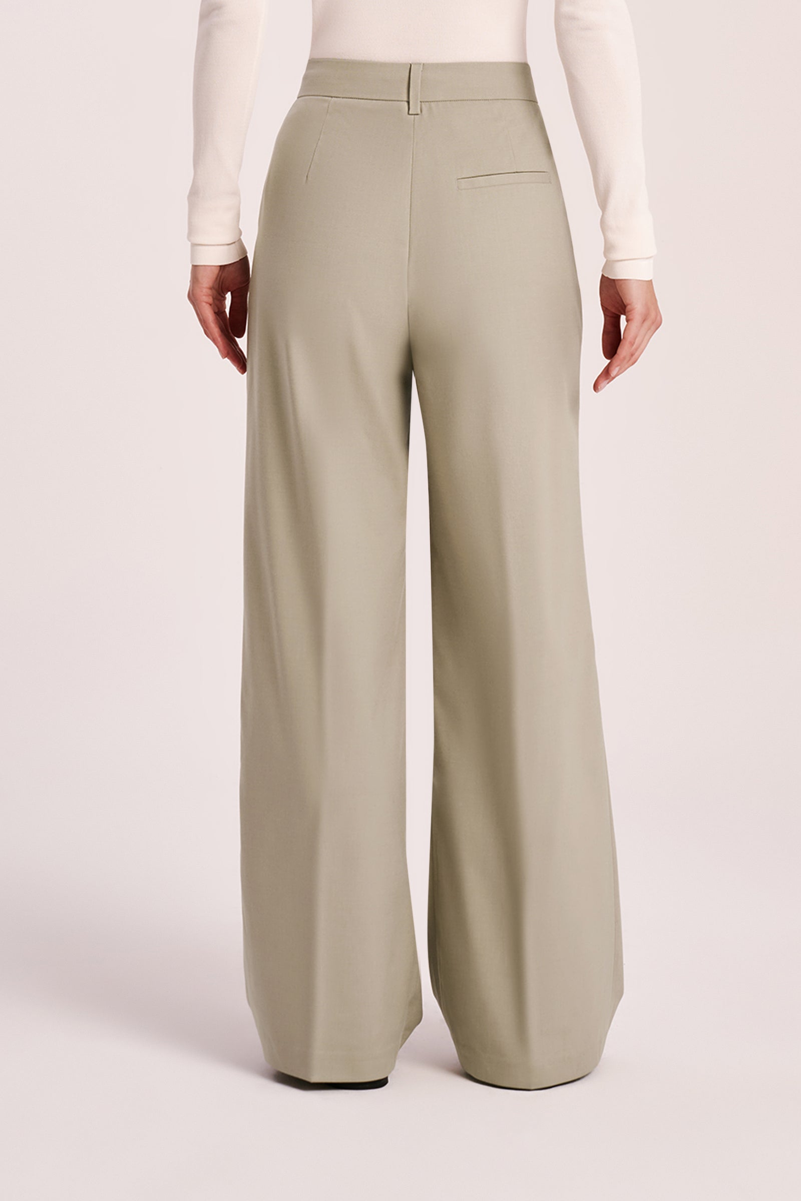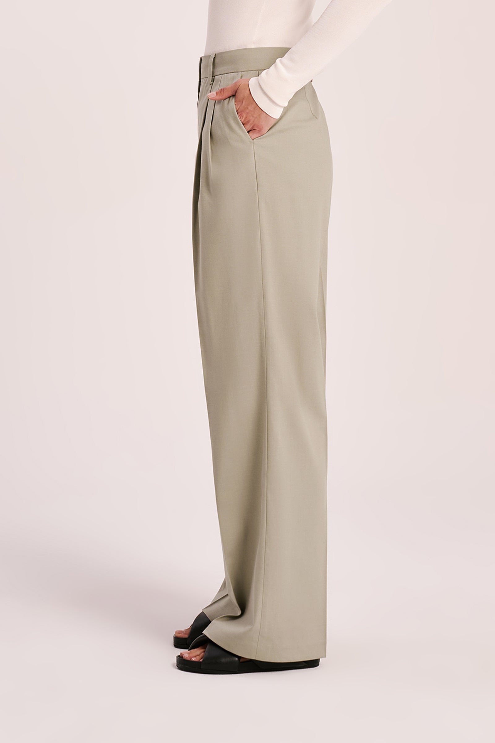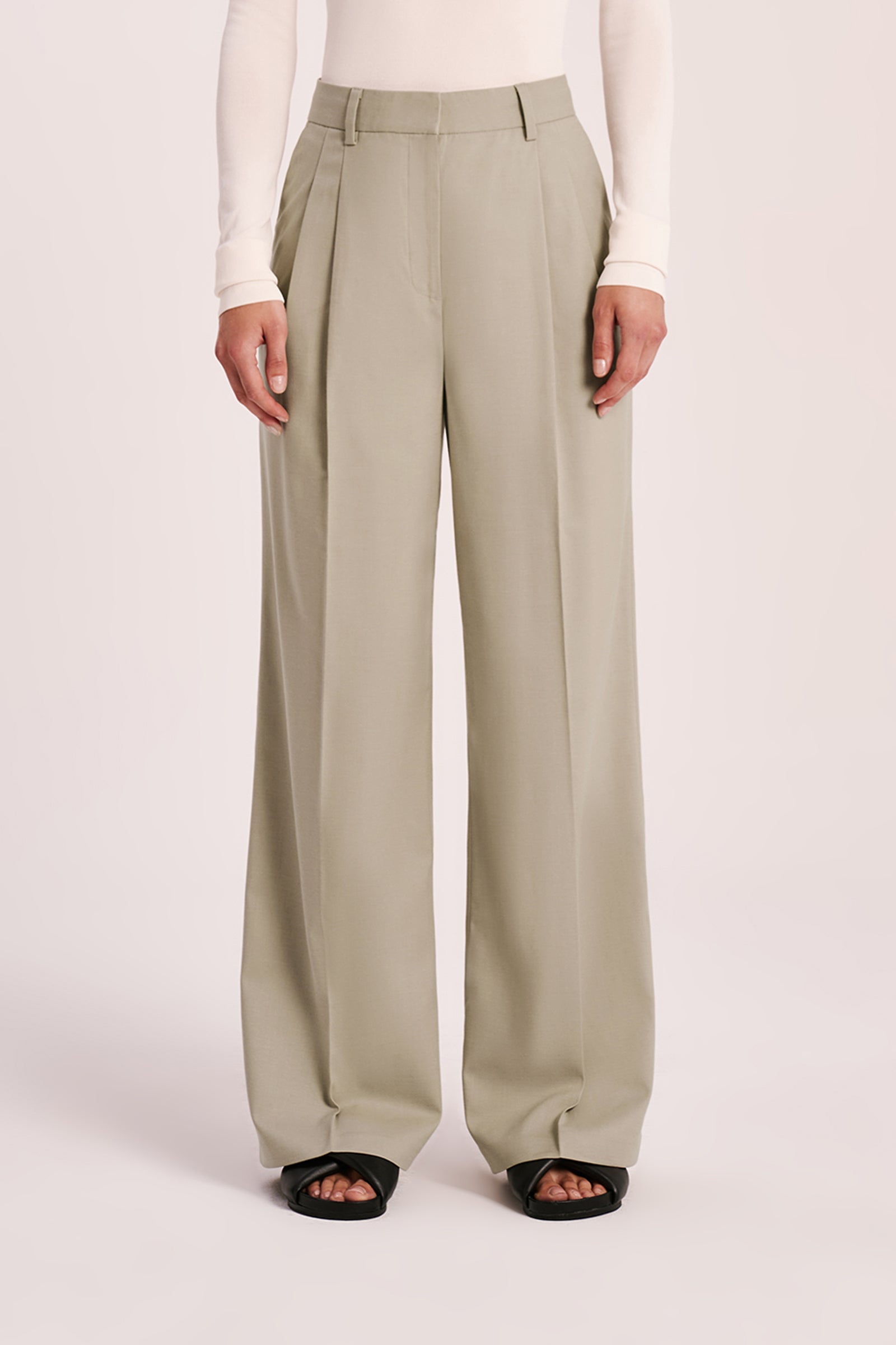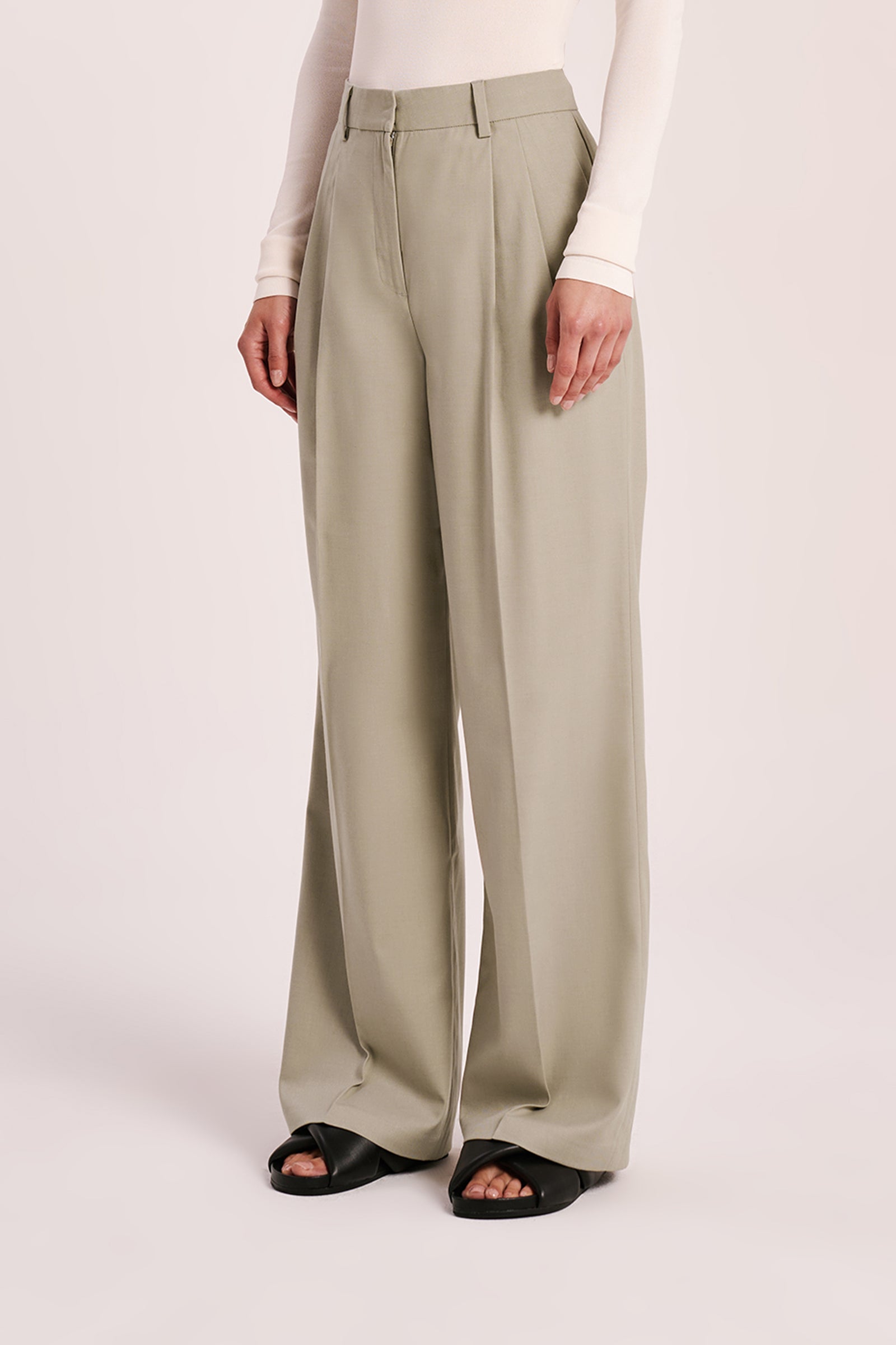 The Rana Pant is made from a classic wool blend suiting fabrication with a smooth hand feel. The silhouette is tailored with a high rise and wide leg. Features include front pleats at waist, concealed trouser hook closure and Nude Lucy branded internal waist banding.