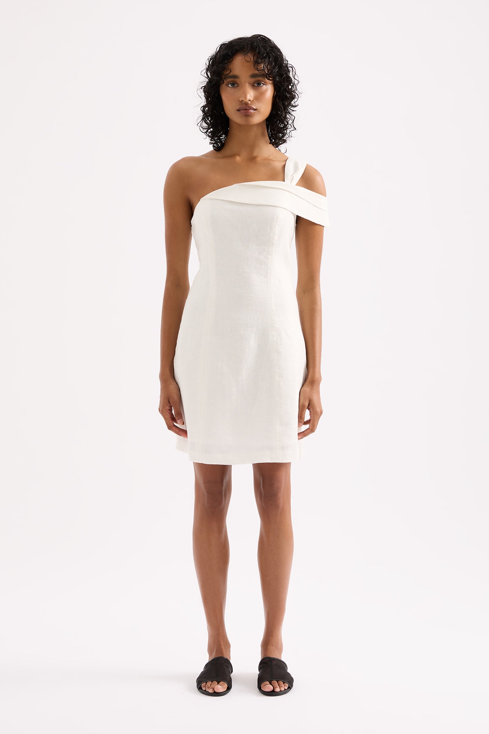 The Reese Linen Mini Dress is made from 100% Linen which has been washed for a soft, breathable hand feel. The silhouette is feminine with asymmetric shoulder strap detail, fitted waist and mini A-line skirt. Features include twist detail on shoulder and invisible zipper on the side. This dress is fully lined.