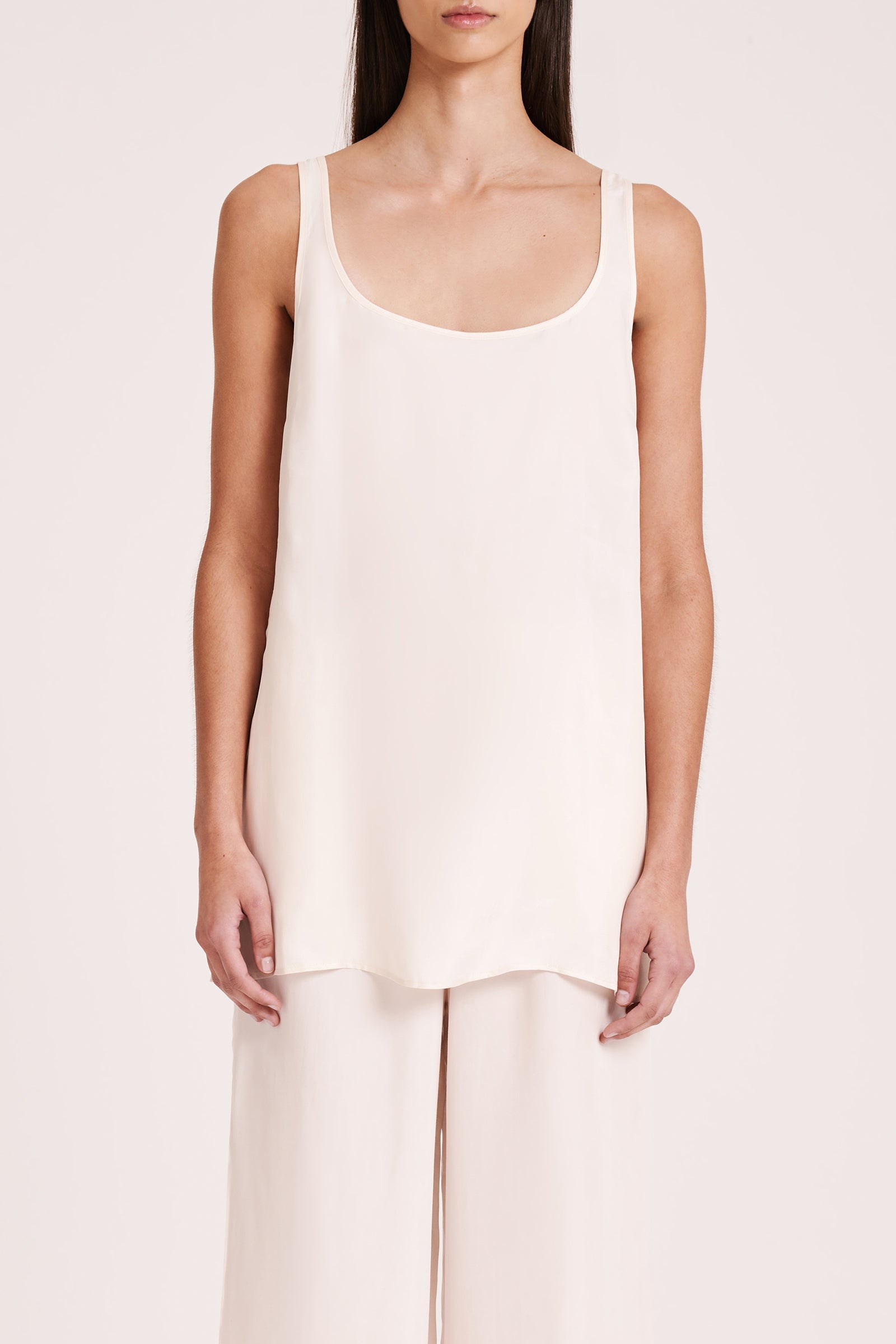 The Ren Cupro Tunic is made from our signature cupro fabrication with a smooth suede hand feel. The silhouette drapes over the body and length finishes at the hips. Features include a scoop neckline and side seam splits.