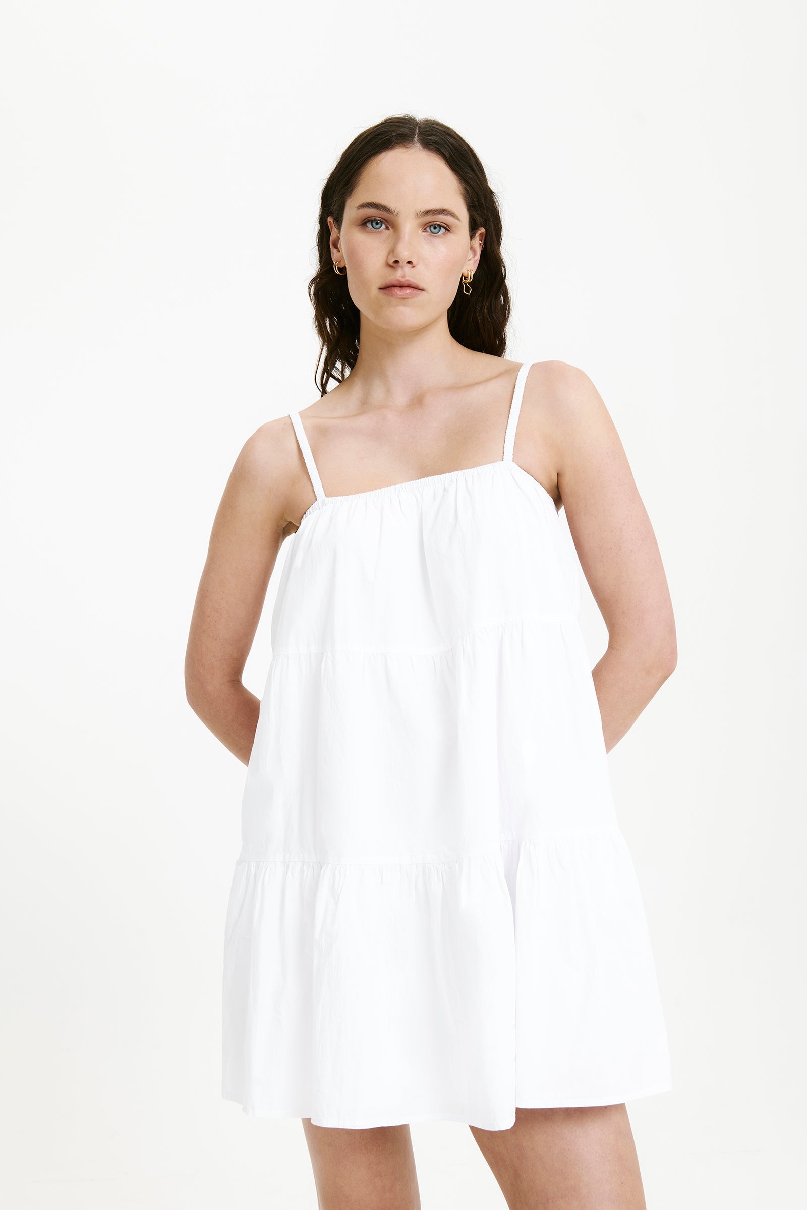 Made in our heavier weight 100% cotton poplin with a soft peached handfeel. The Renna Mini Dress is a classic babydoll silhouette with fullness throught the entire body. Mini in length, this dress features a square elasticated neckline, elasticated straps, gathered tiers and side seam pockets.