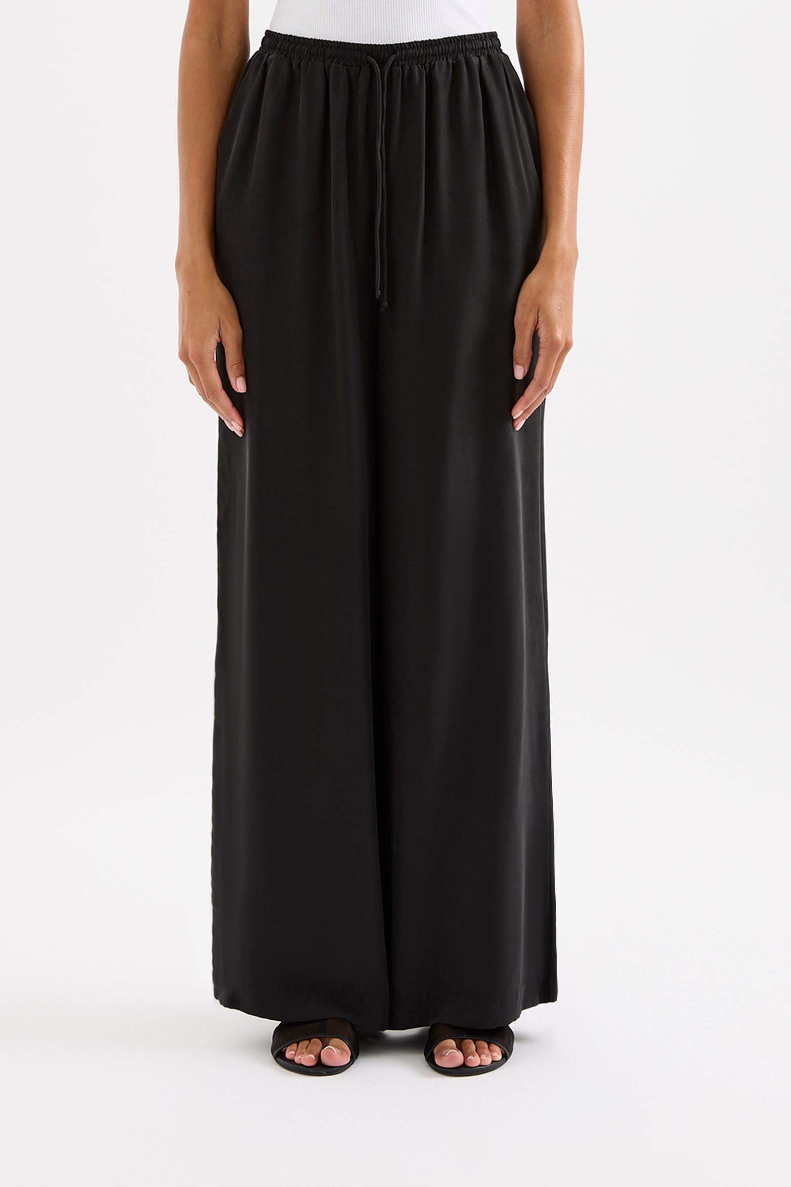 The Rika Cupro Pant is made from our signature cupro fabrication with a smooth suede hand feel. The silhouette is a relaxed wide leg, full length pant. Features include a an elasticated waistband with a drawstring tie and side seam pockets.