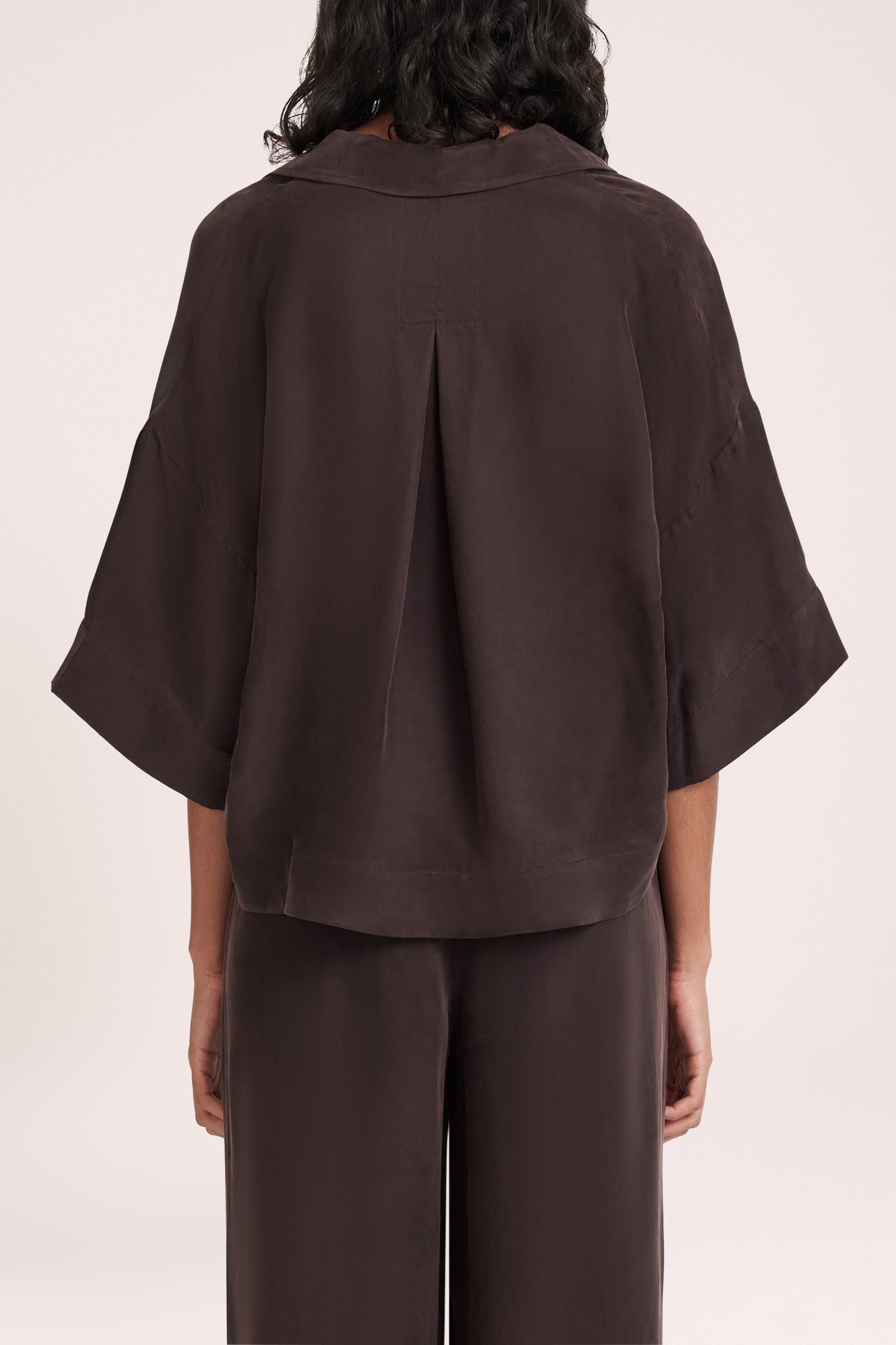 The Rika Cupro Shirt is made from our signature cupro fabrication which has a smooth suede hand feel. The silhouette is relaxed with wide, elbow length sleeves and length finishing above the hips. Features include a wide collared neckline and button front opening.