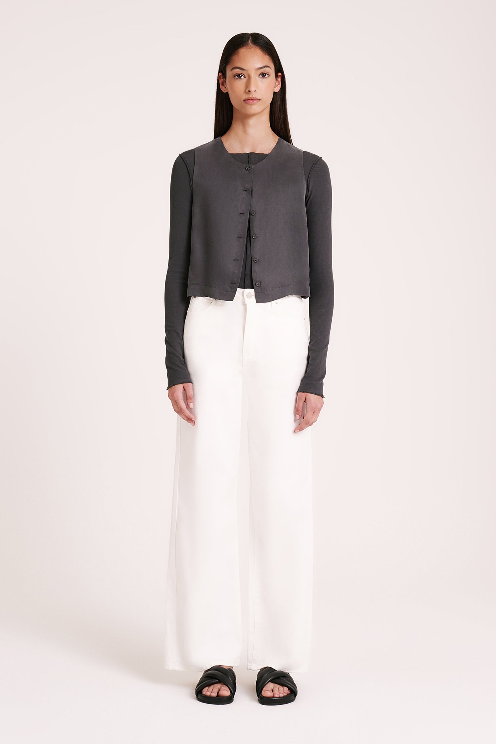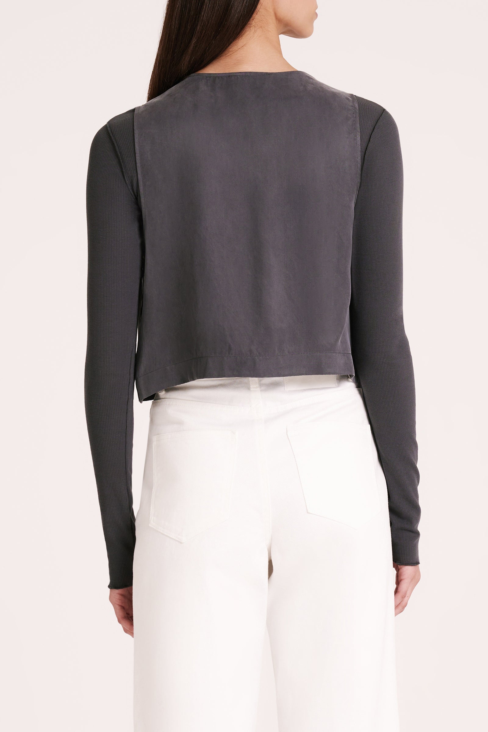 The Rika Cupro Vest is made in our signature cupro fabrication, with a soft, velvety handfeel. The silhouette is a cropped relaxed fit finishing above the hips. Features include crew neck with button front opening.