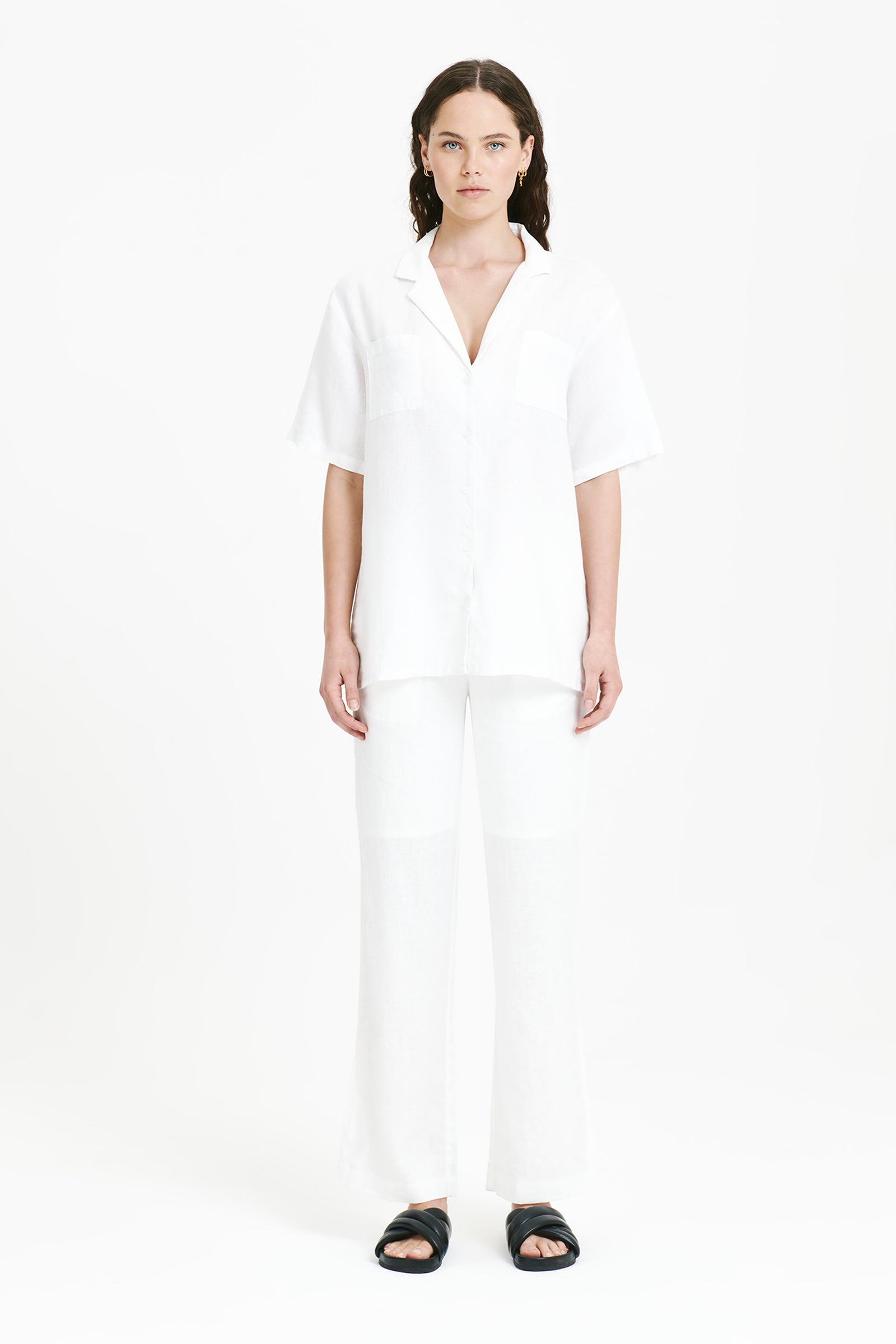 The Rynn Linen Resort Shirt is cut from a premium 100% Linen that has been washed down to create a soft, breathable handfeel. Sillouhette is relaxed with a drop shoulder and slightly oversized body. Classic shirting features include front patch pockets, traditional shirt collar and front button opening. Length finishes just below the hips.