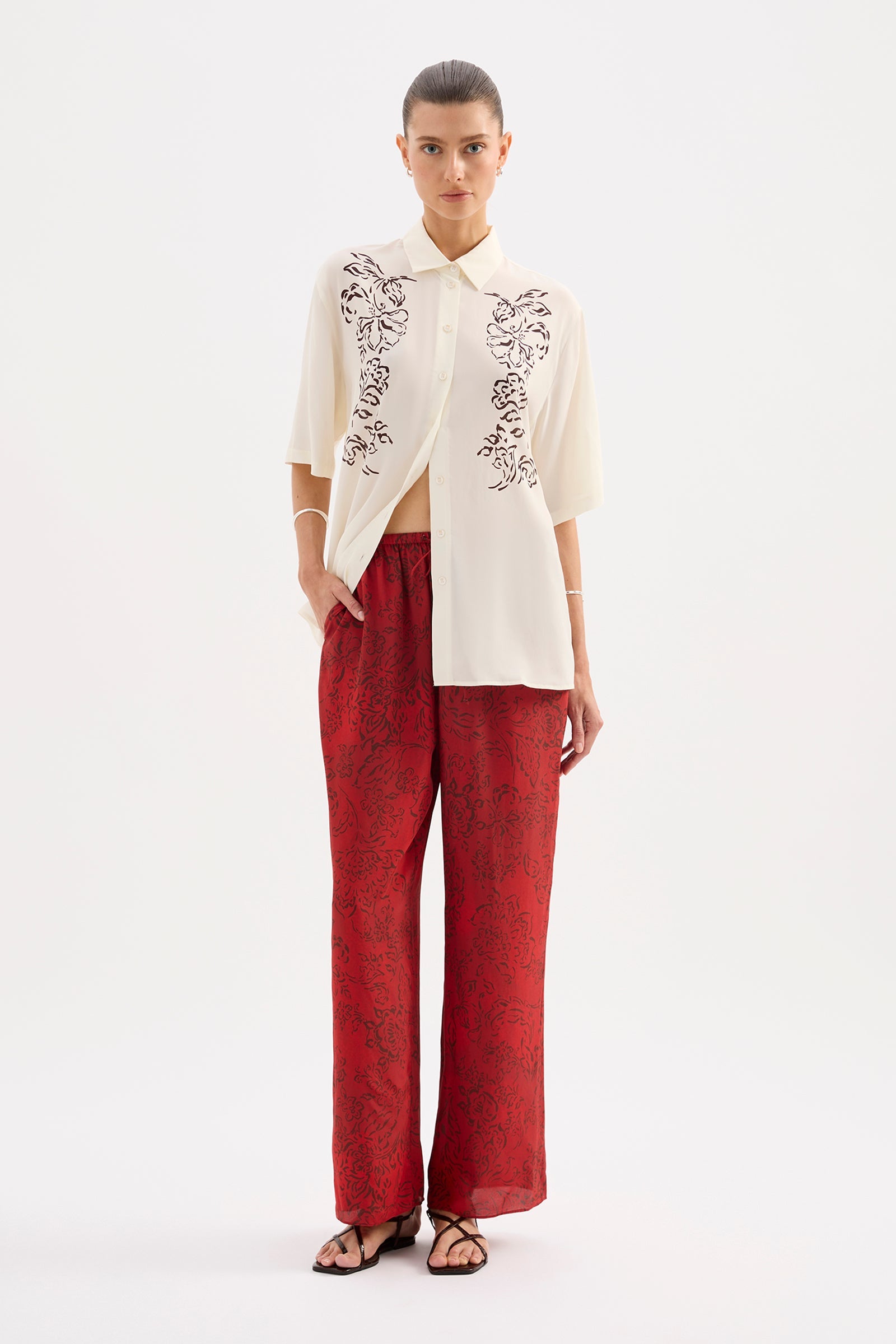The Saffron Shirt is made from a fluid silk blend fabrication and features bespoke and exclusive Saffron print. The silhouette is relaxed through the body, elbow length sleeves and length finishing at the hip. Features include classic shirting details and branded buttons.