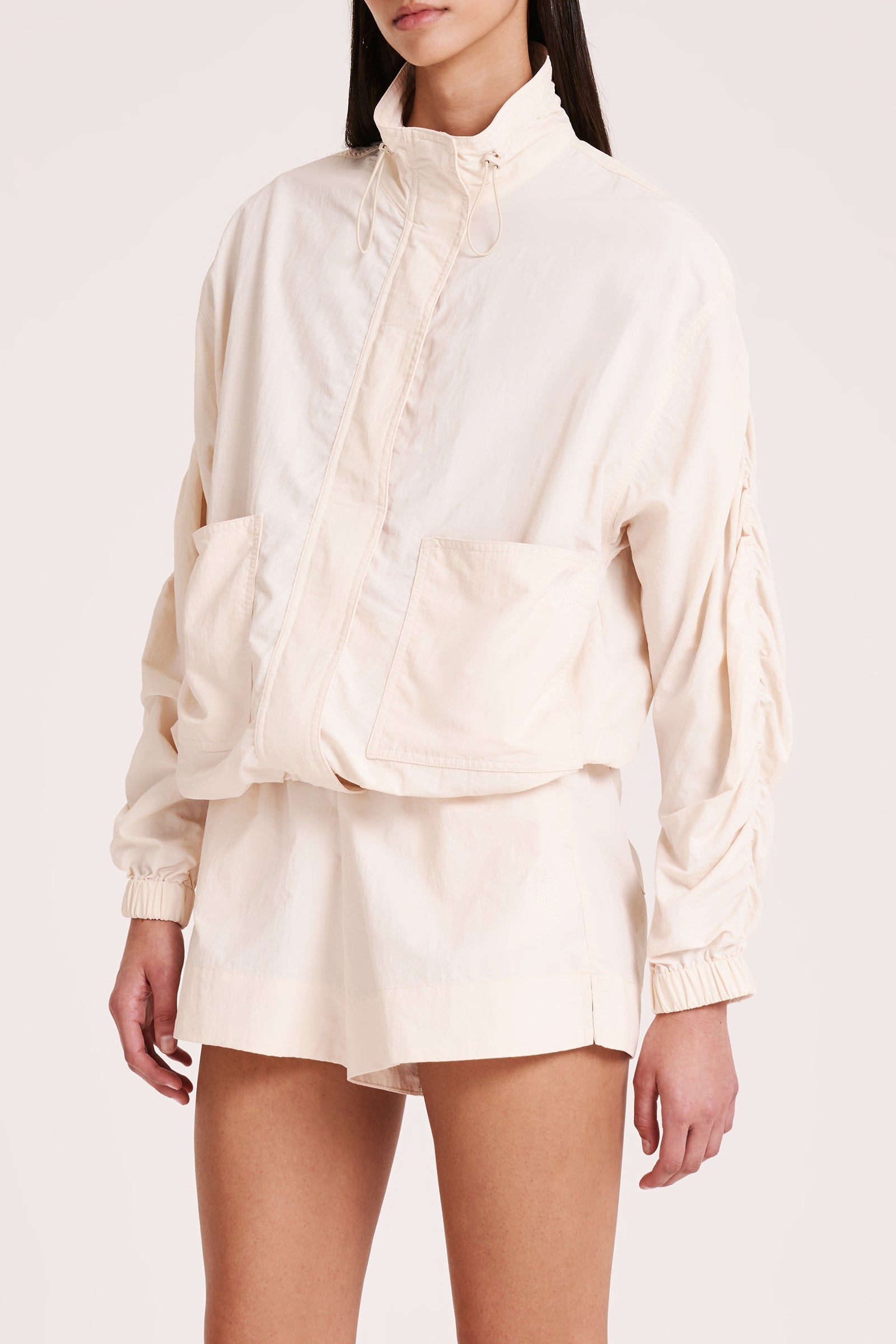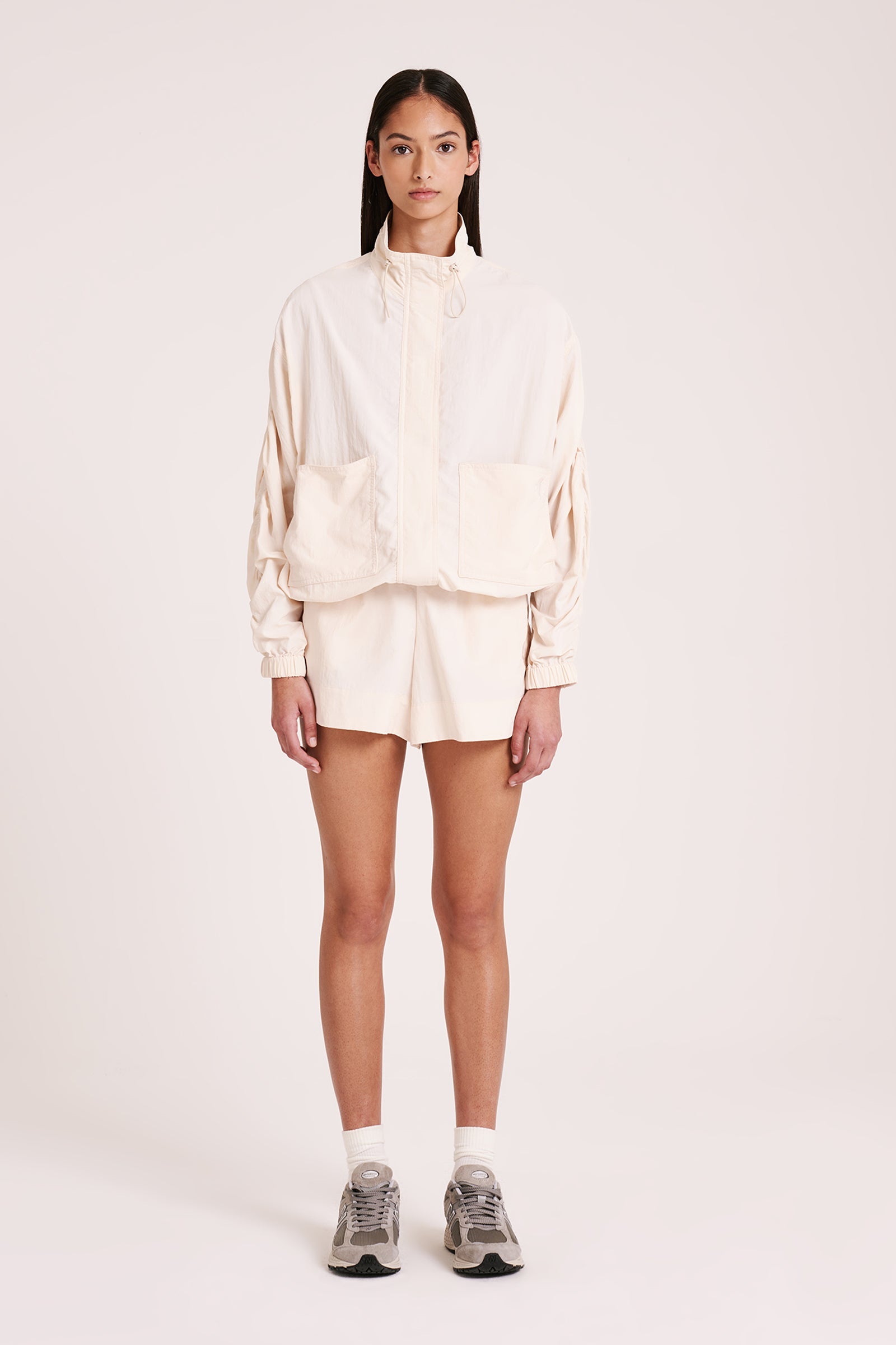 The Senega Jacket is made from a sturdy recycled nylon fabric with a crisp hand feel. The silhouette is relaxed with an internal elastic cord on the hem to adjust to crop length or sit on the hips. Features include a front patch pockets, centre front zipper and Nude embroidered logo.