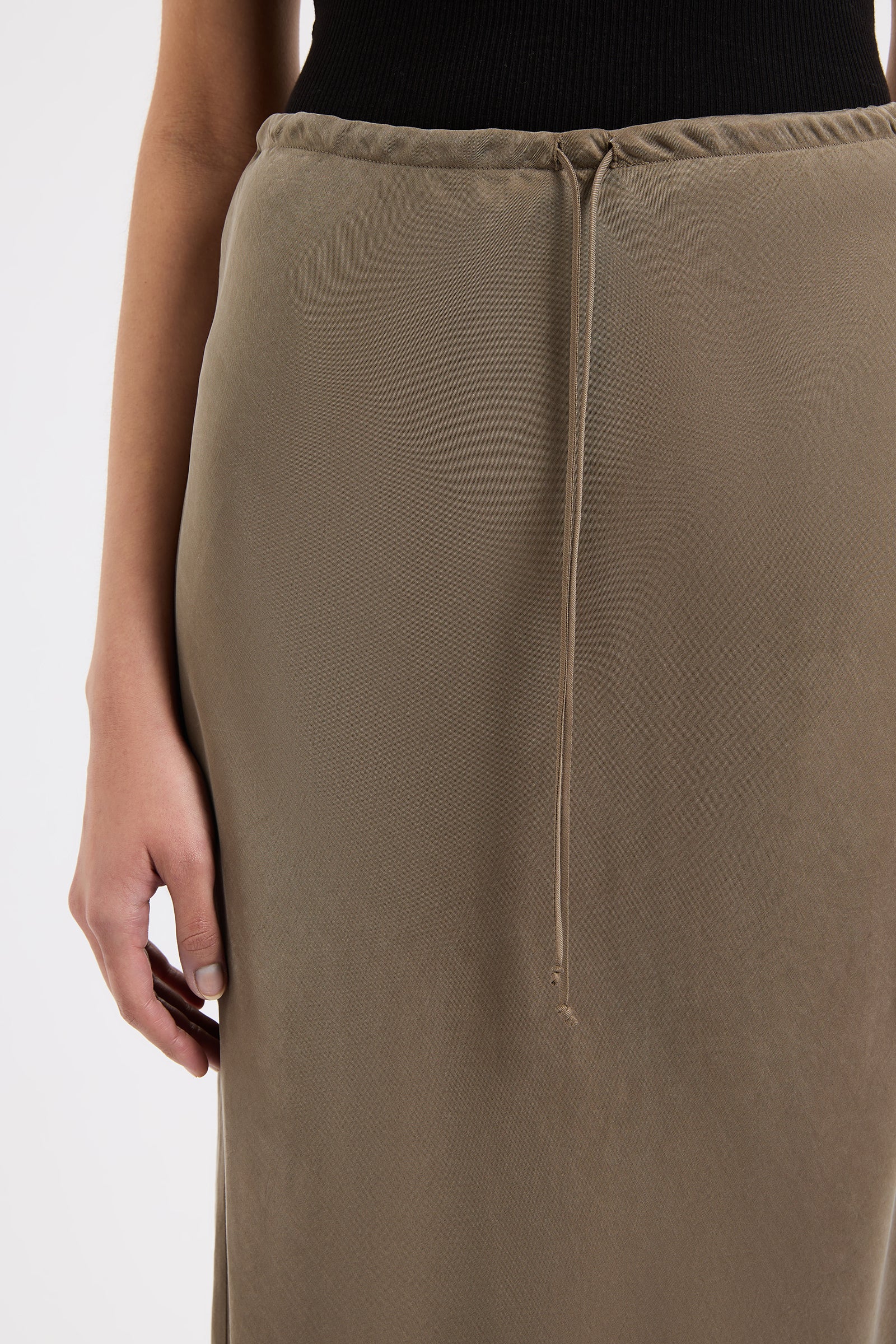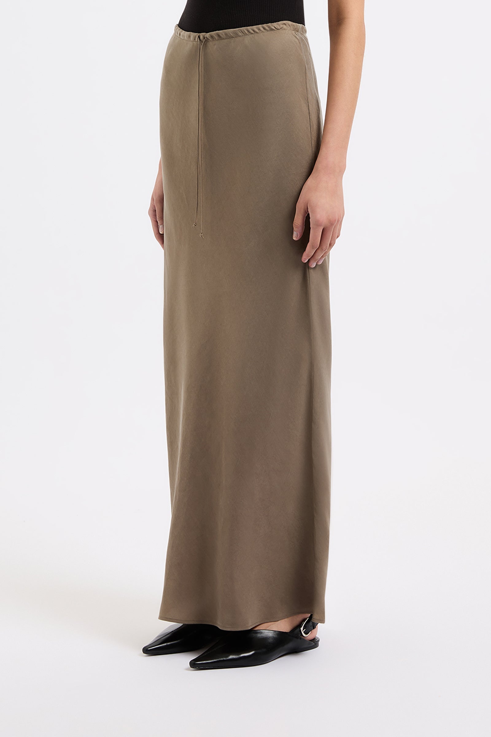 The Seshni Tencel Maxi Skirt is made from a Tencel blend fabrication with a soft, sueded hand feel. Cut on the bias, this silhouette finishes just above the ankles. Features include encased elasticated waistband with a self cut draw string at centre front.