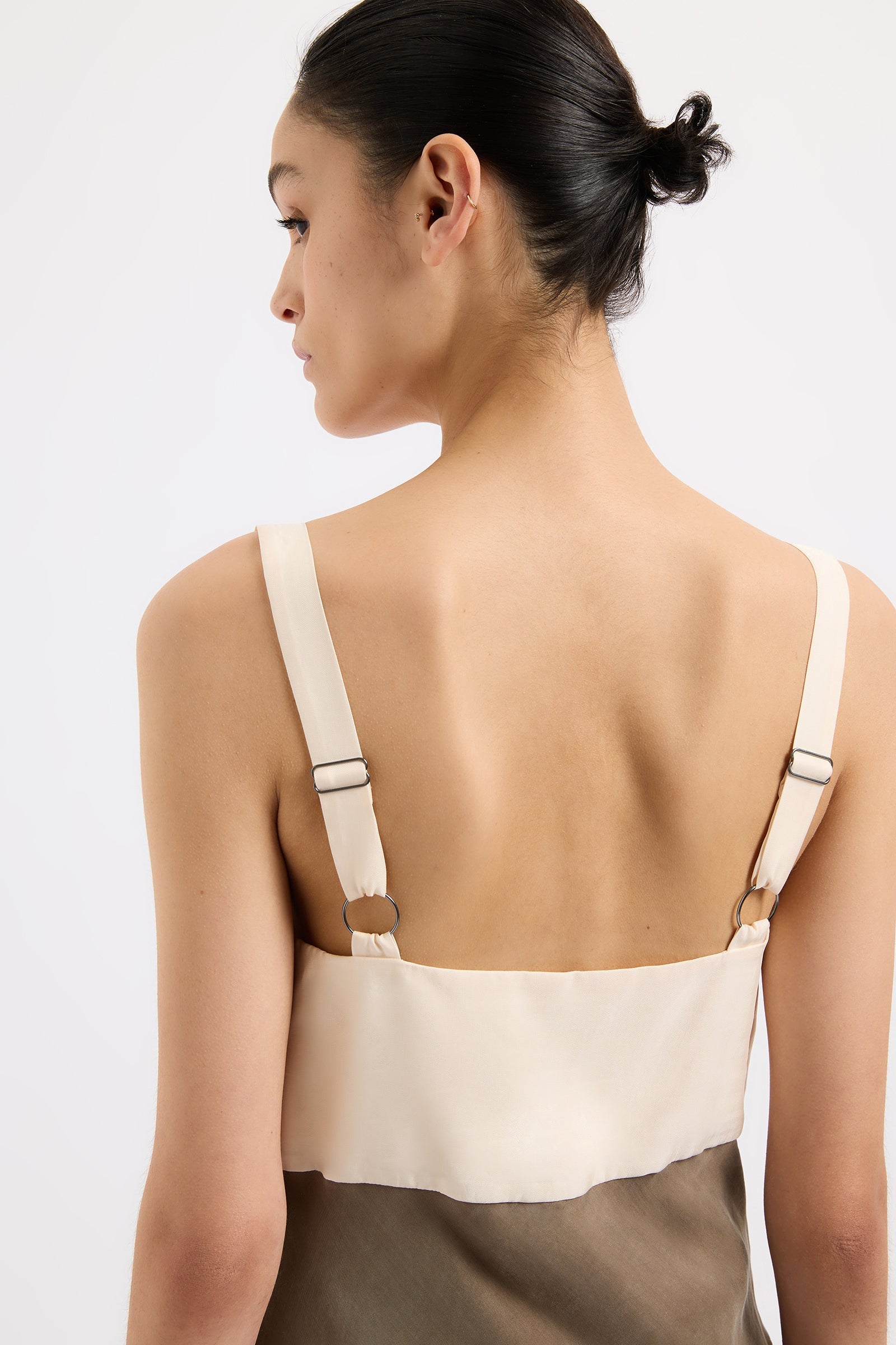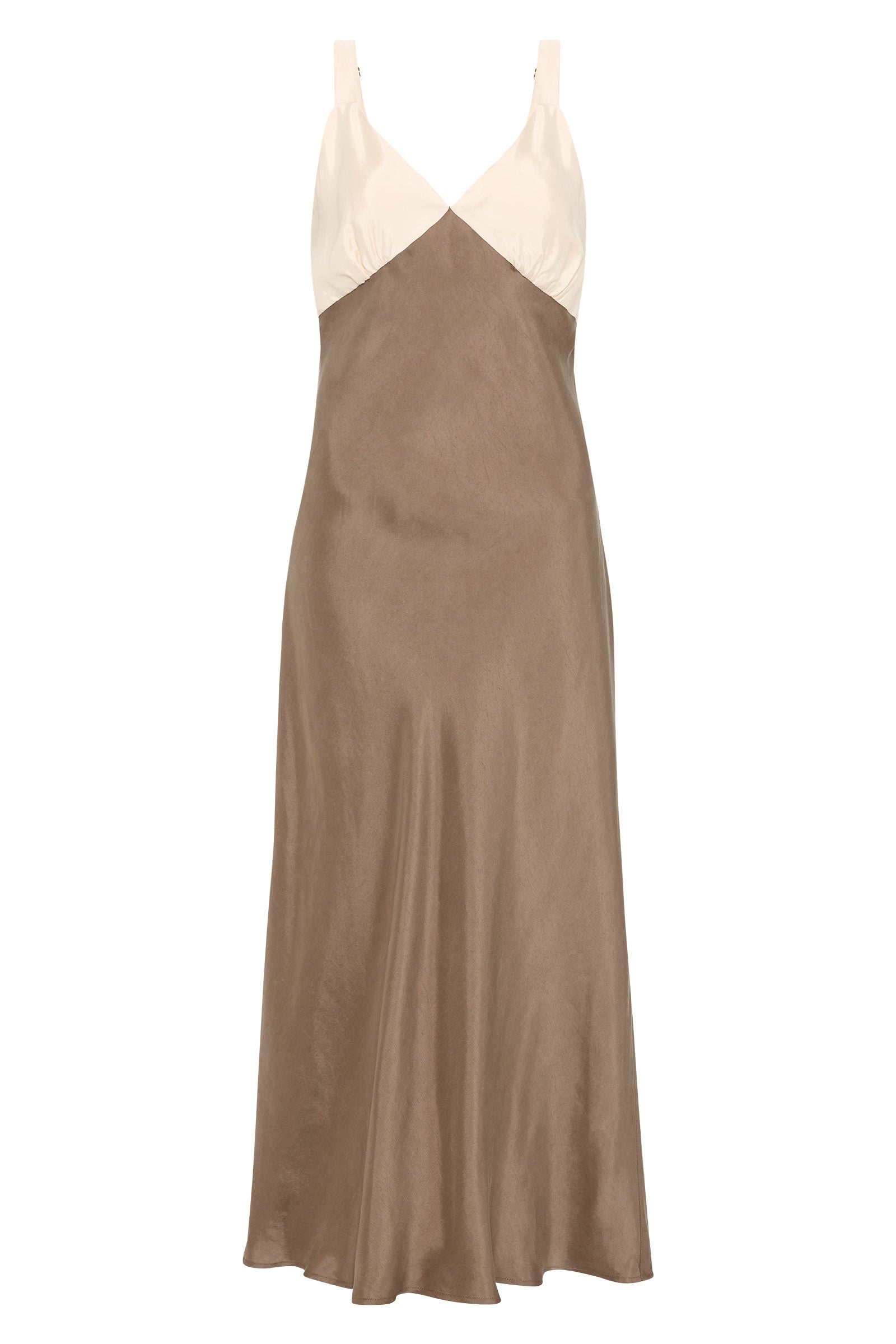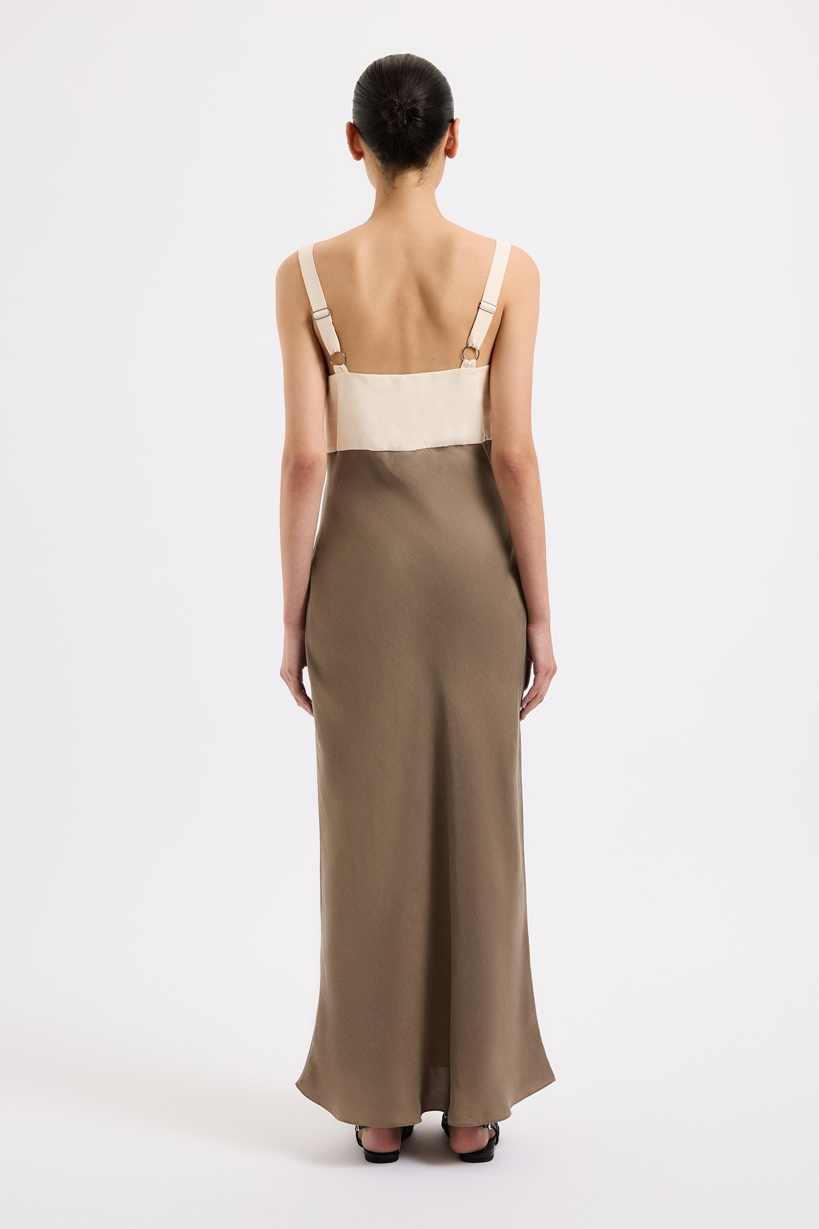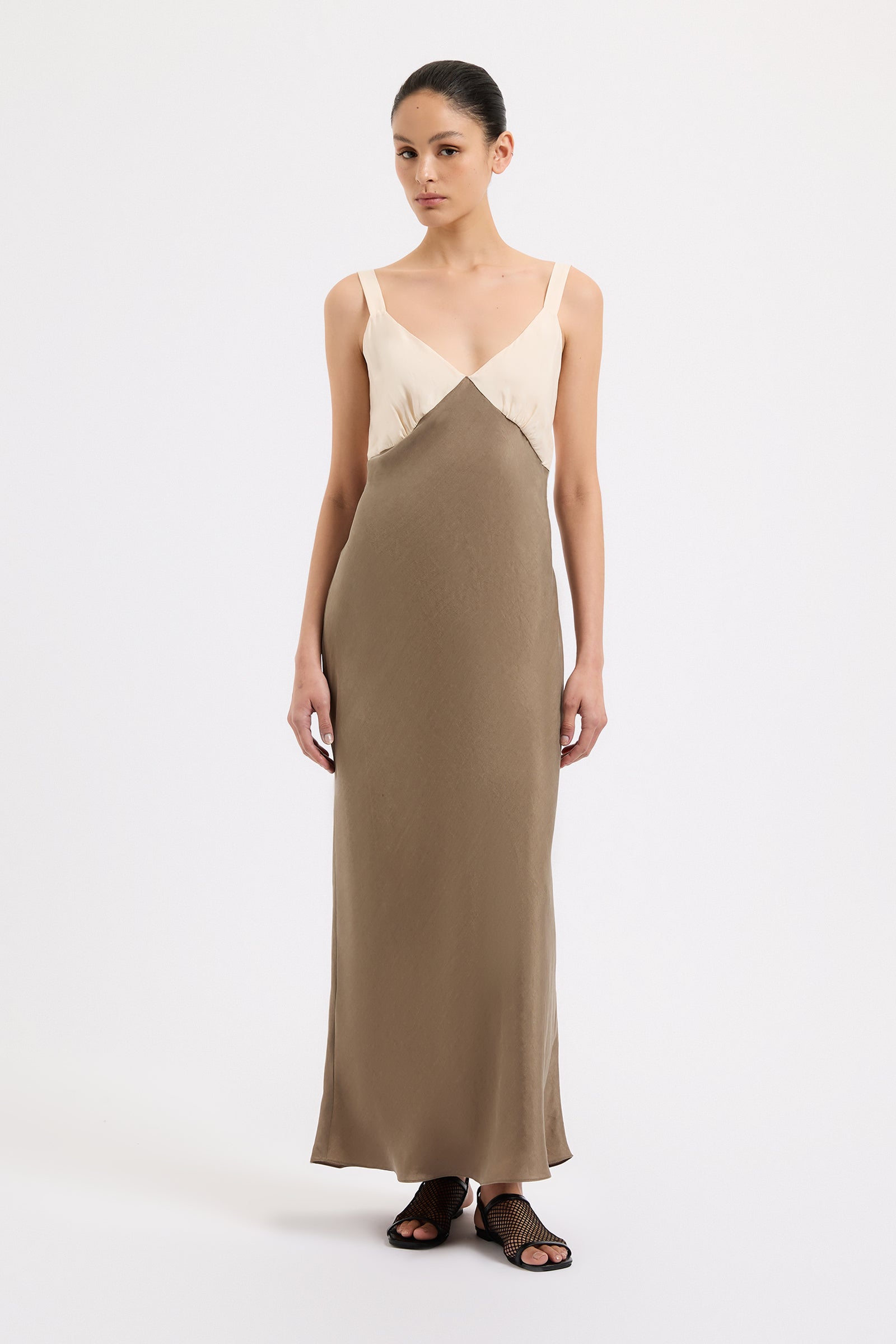 The Seshni Tencel Slip Dress is made from a Tencel blend fabrication with a soft, sueded hand feel. Cut on the bias, this silhouette drapes over the body softly and finishes ankle length. Features include contrast coloured bust panel, v neckline with a gathered under bust seam and thick adjustable shoulder straps.