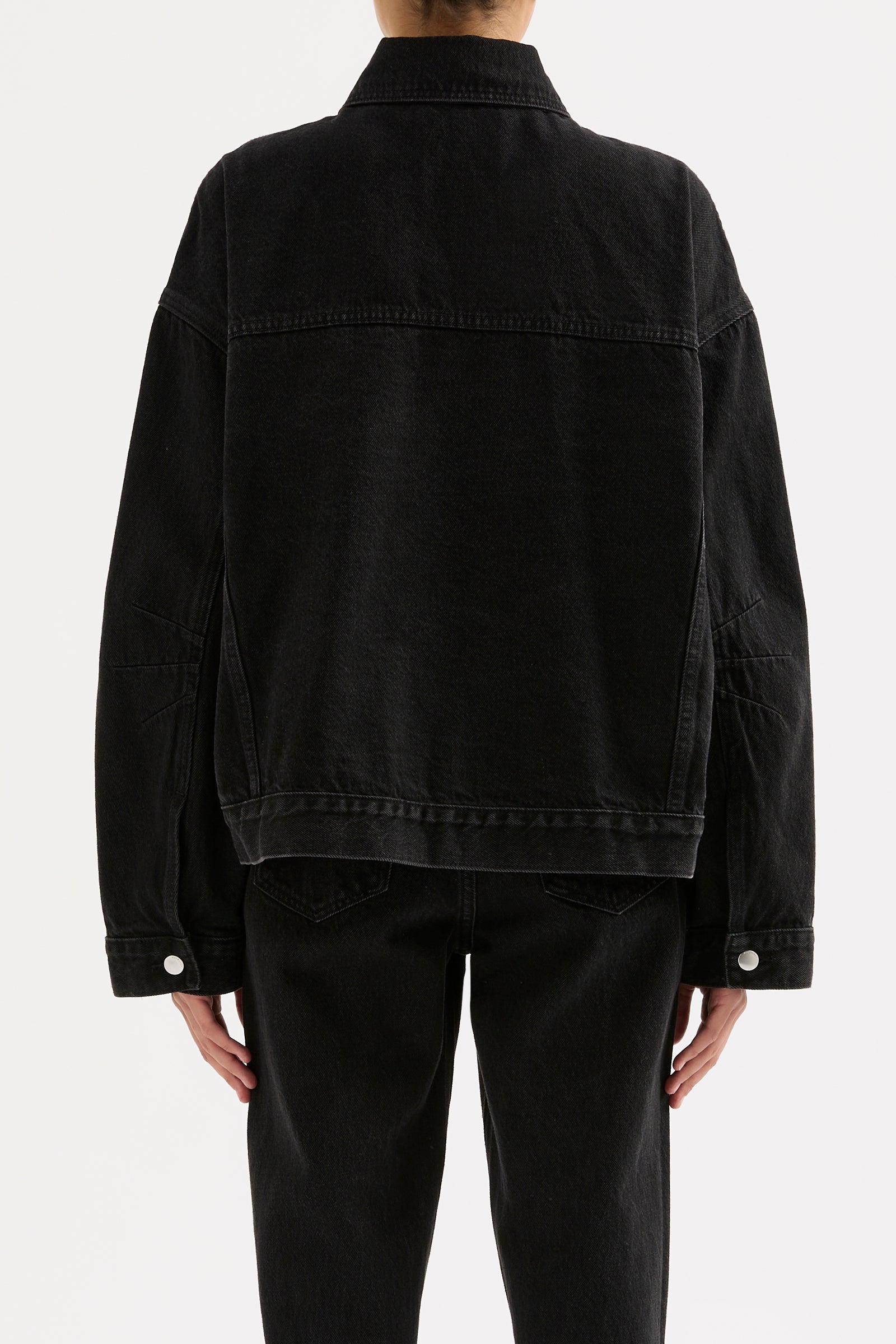 The Sia Denim Jacket is made from our 12 oz 100% organic cotton denim with a Vintage Black stone wash. The silhouette is oversized with a drop shoulder and length finishing at the hips. Features include front chest pockets, side welt pockets, panel detailing & branded shank button through centre and sleeve cuff.