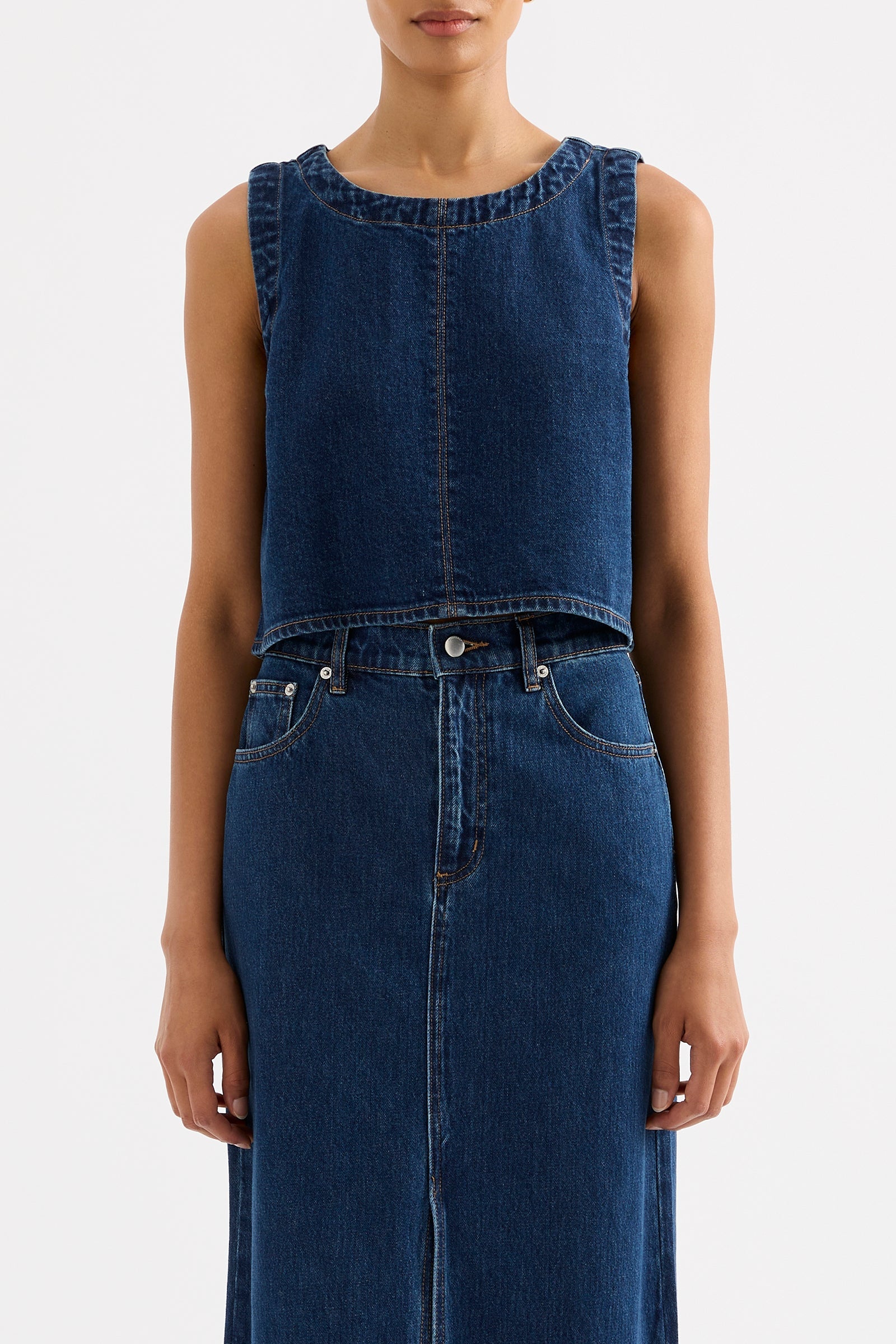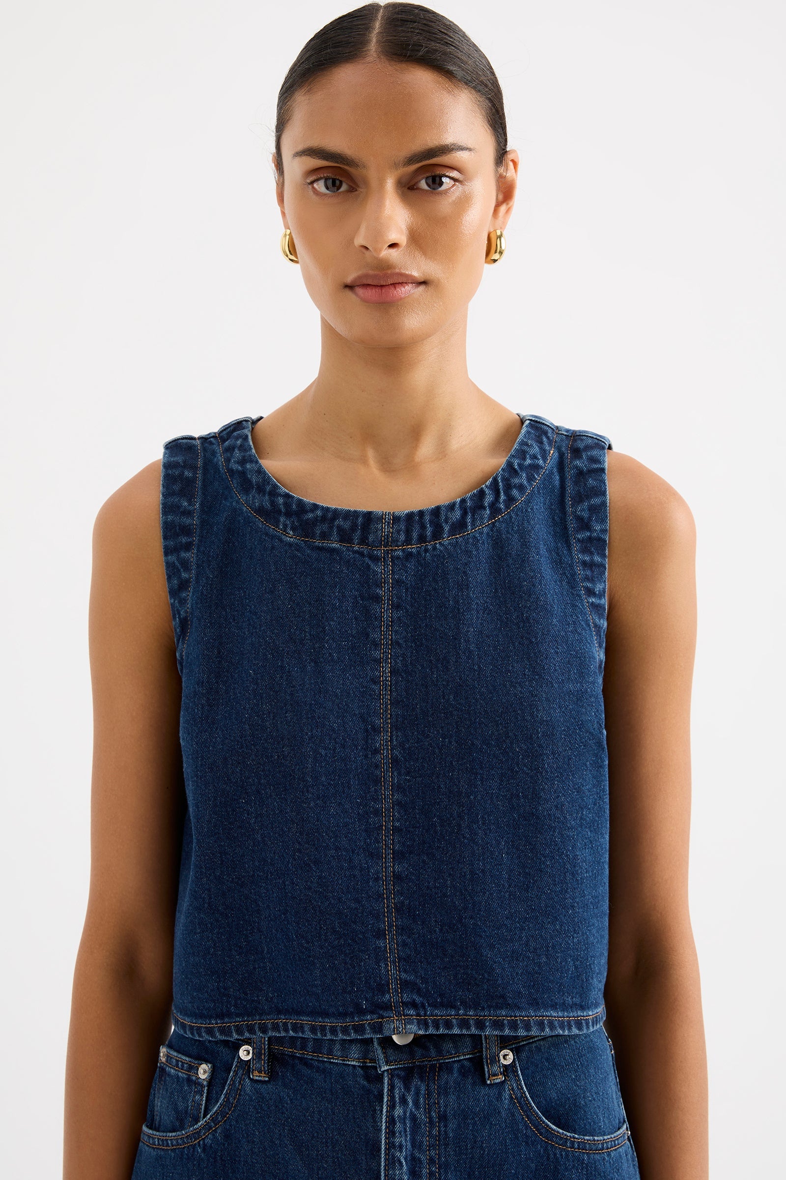 The Sia Denim Top is made from our 12 oz 100% organic cotton denim with a Force Blue stone wash. The silhouette is a clean, casual cropped fit which finishes on the waist. Features include a round, crew neckline and button opening at centre back with Nude Lucy branded tortoiseshell buttons.