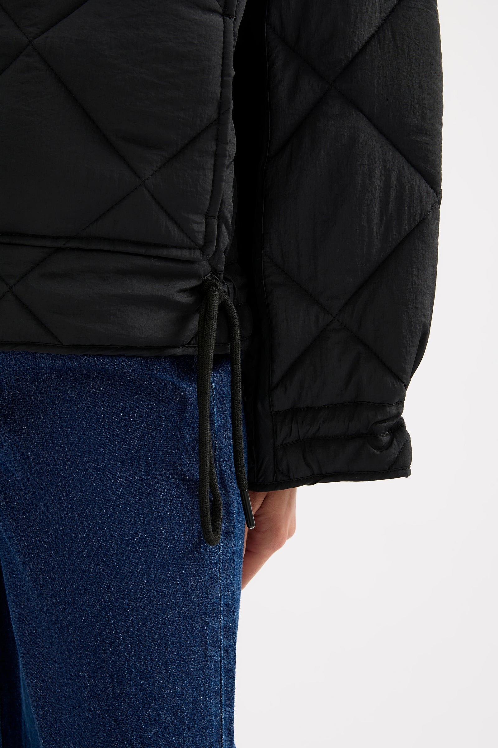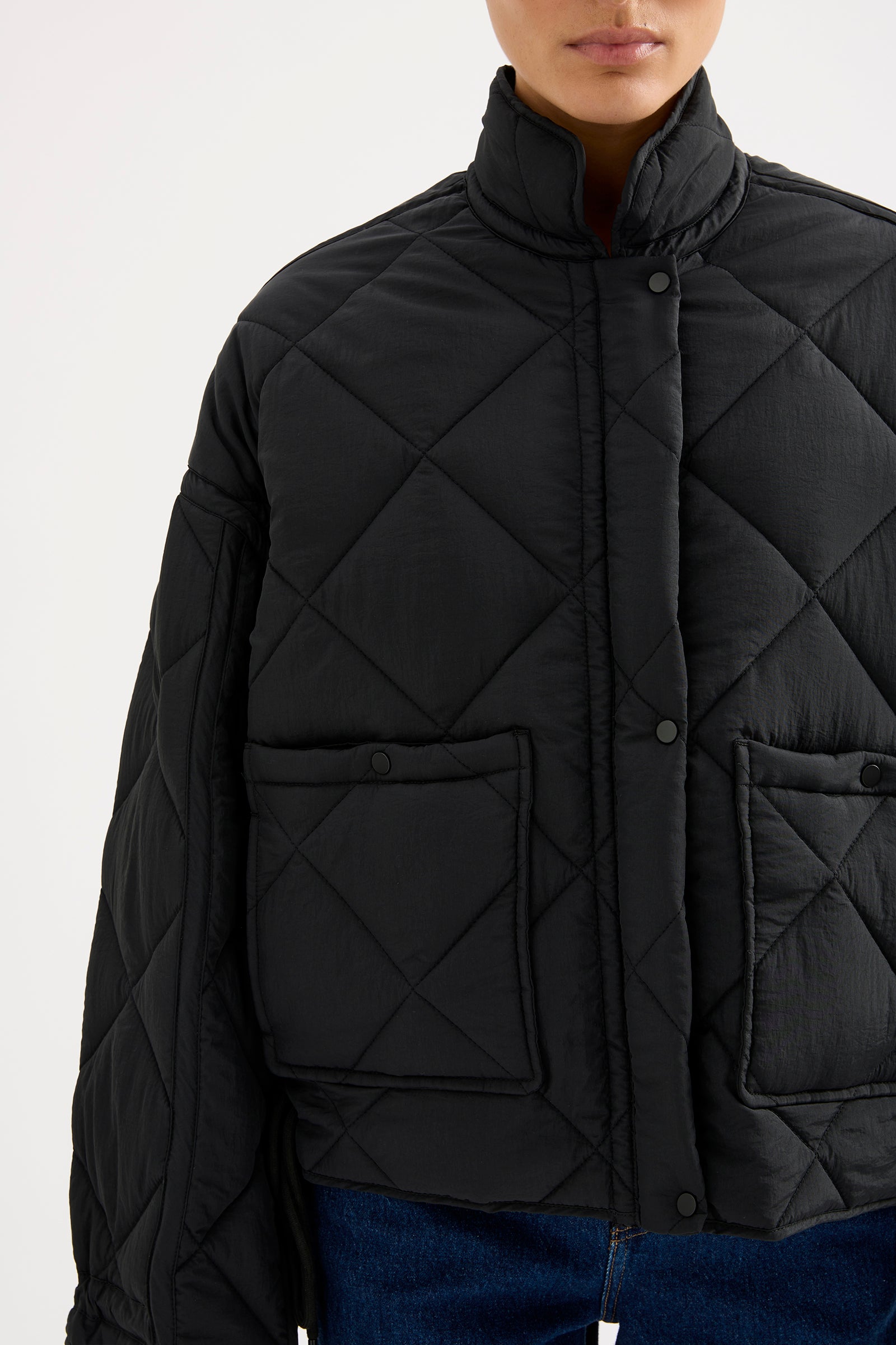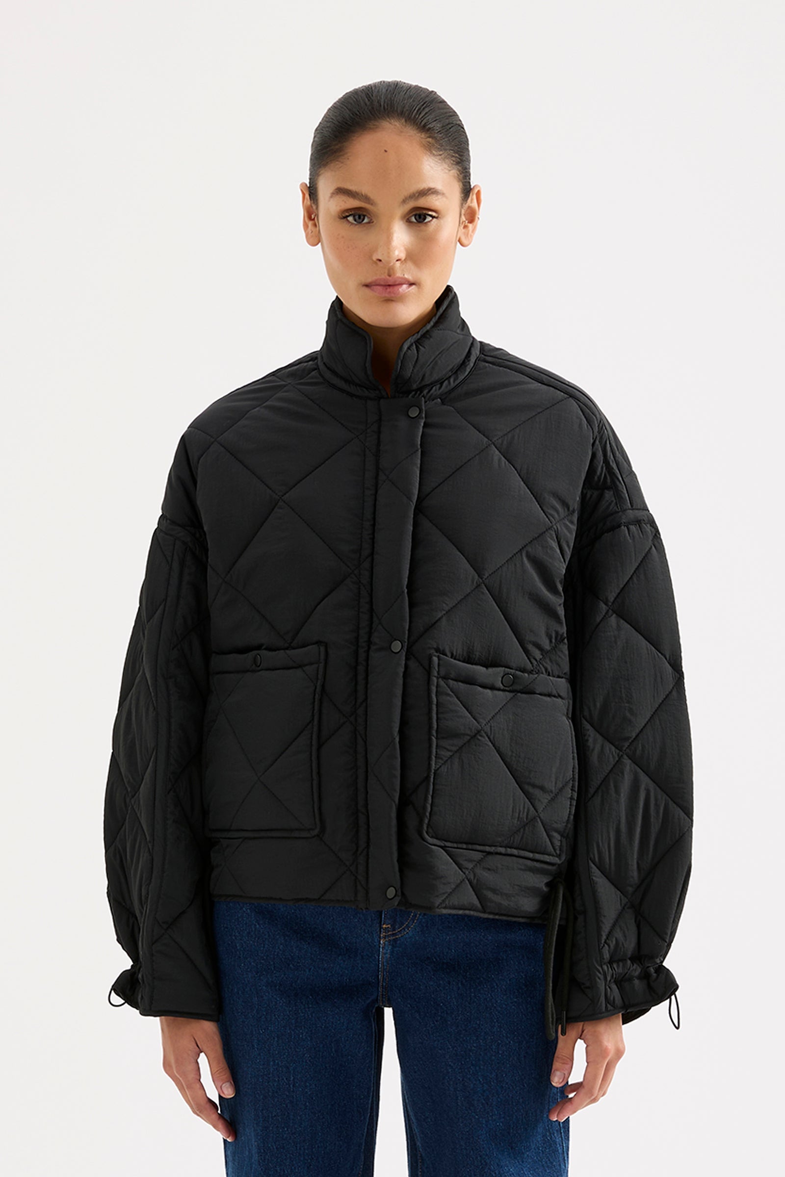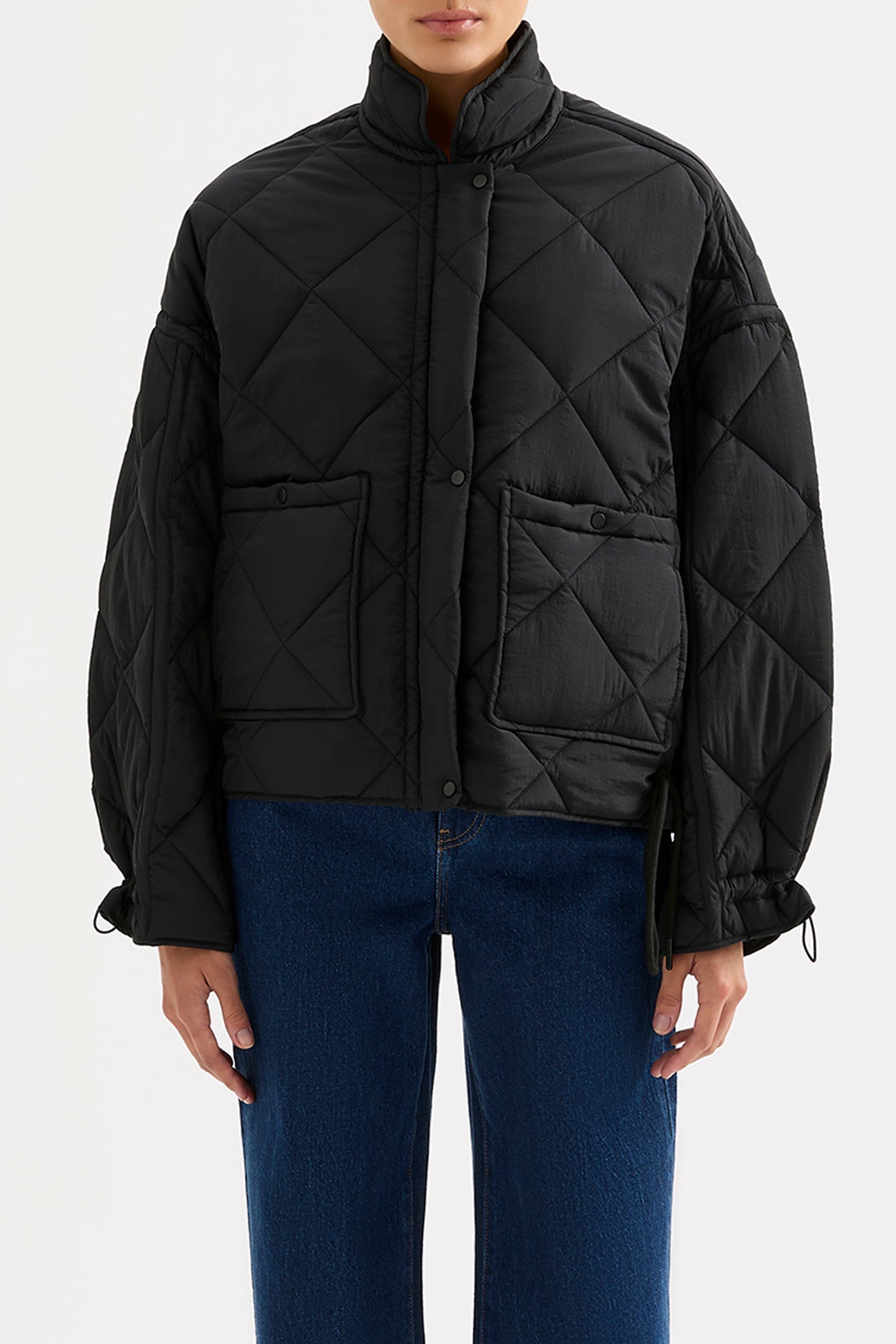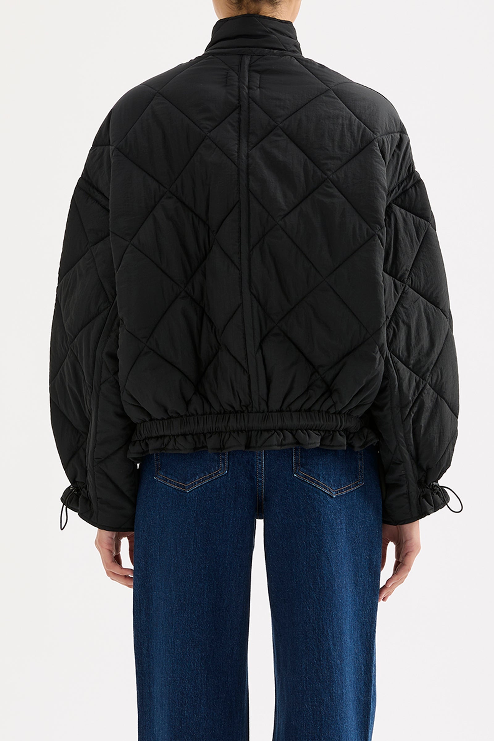 The Sloane Puffer jacket is made from a lightweight breathable nylon which is 100% recycled. The silhouette is a slightly oversized, relaxed shape with high neck and  length finishing at the hip. Features include an adjustable corded drawstring through the hem, elasticated cording at sleeve cuffs,  metal zip opening, and front patch pockets that have 2 functional openings through the top and side of pocket.