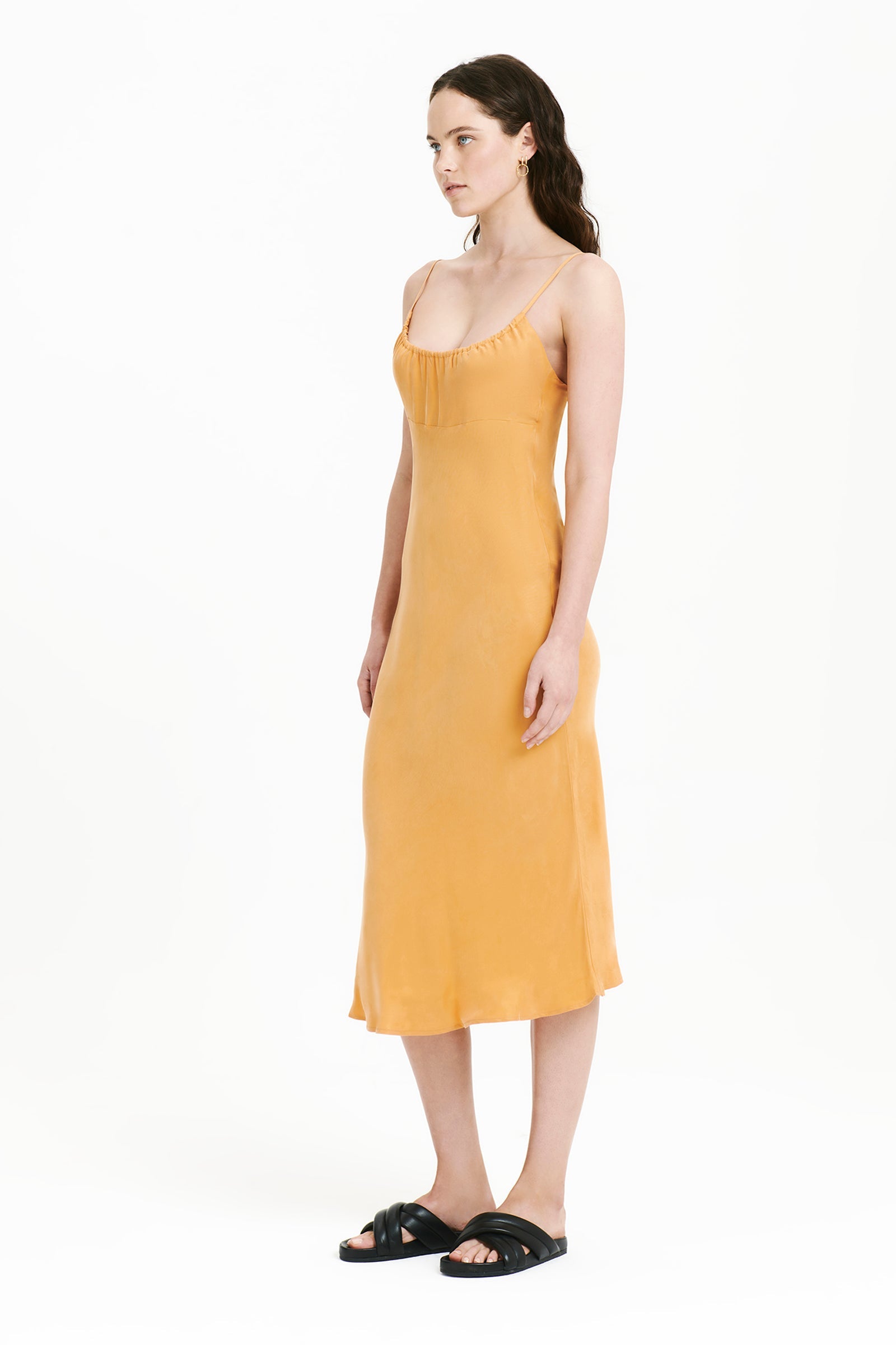 Made in our signature Cupro fabrication, The Sol Cupro Dress is a bias cut silhouette finishing mid length. Features include a gathered neckline, an underbust seam and straps that channel through neckline with adjusters at the back.