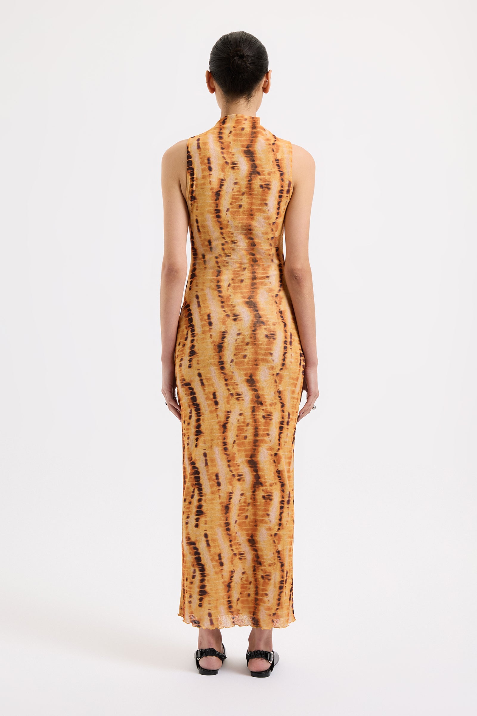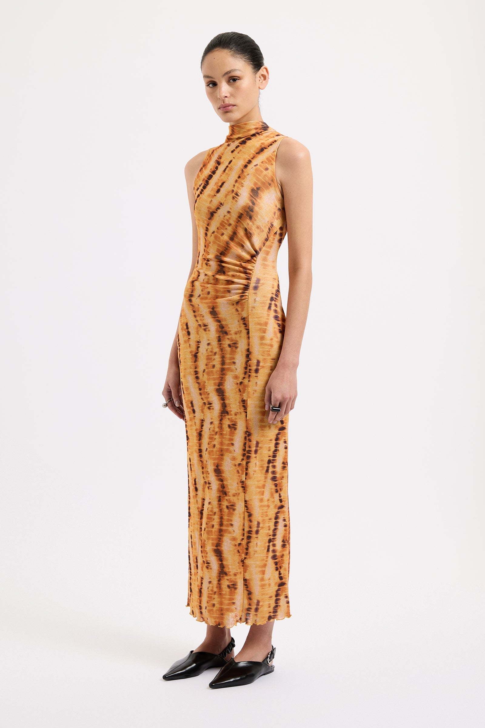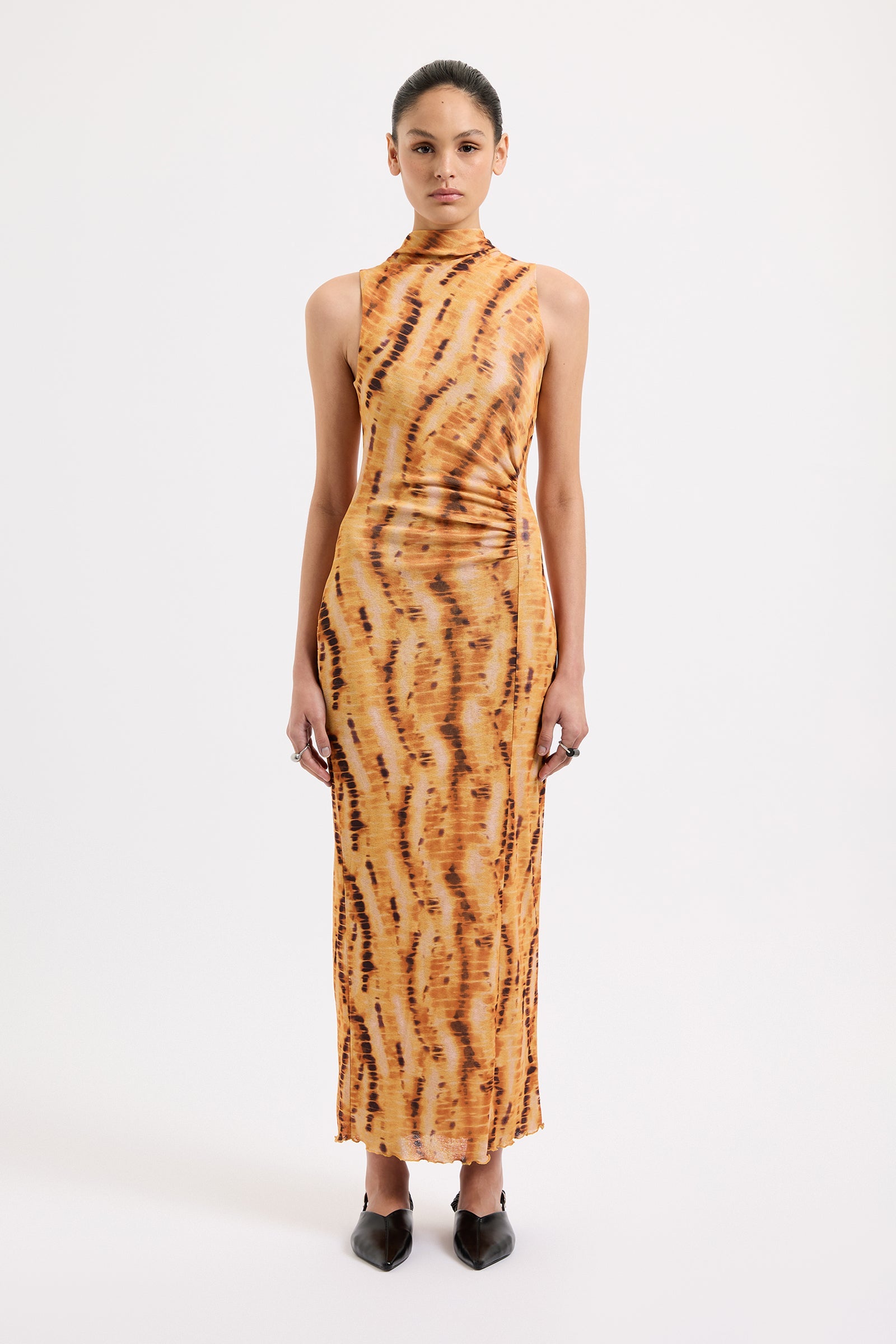 The Solis Mesh Dress is made from a stretch jersey in our exclusive Solis print. The silhouette is form fitting with length finishing above the ankles. Features include a high cowled neckline and ruching at the side. This dress is fully lined.