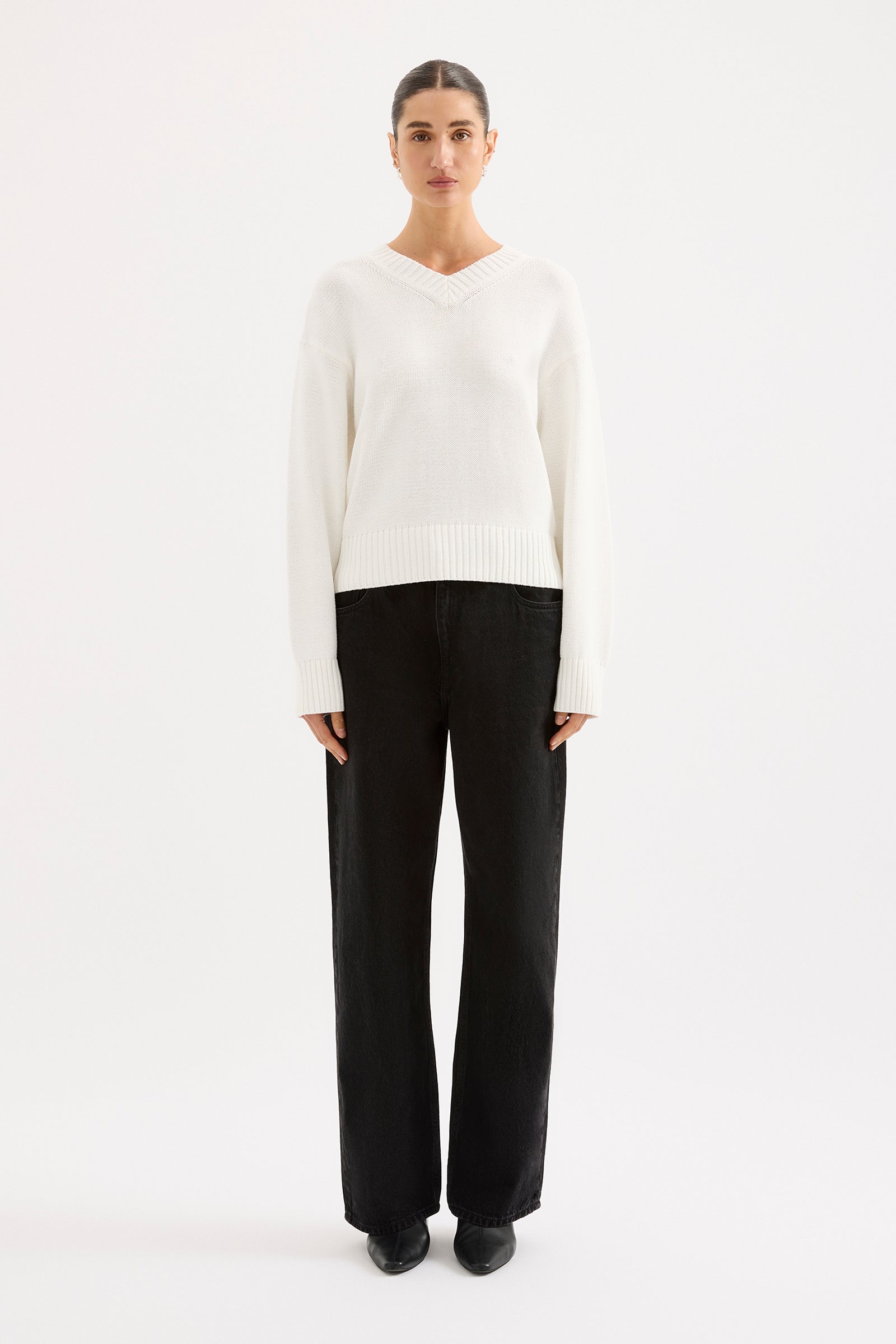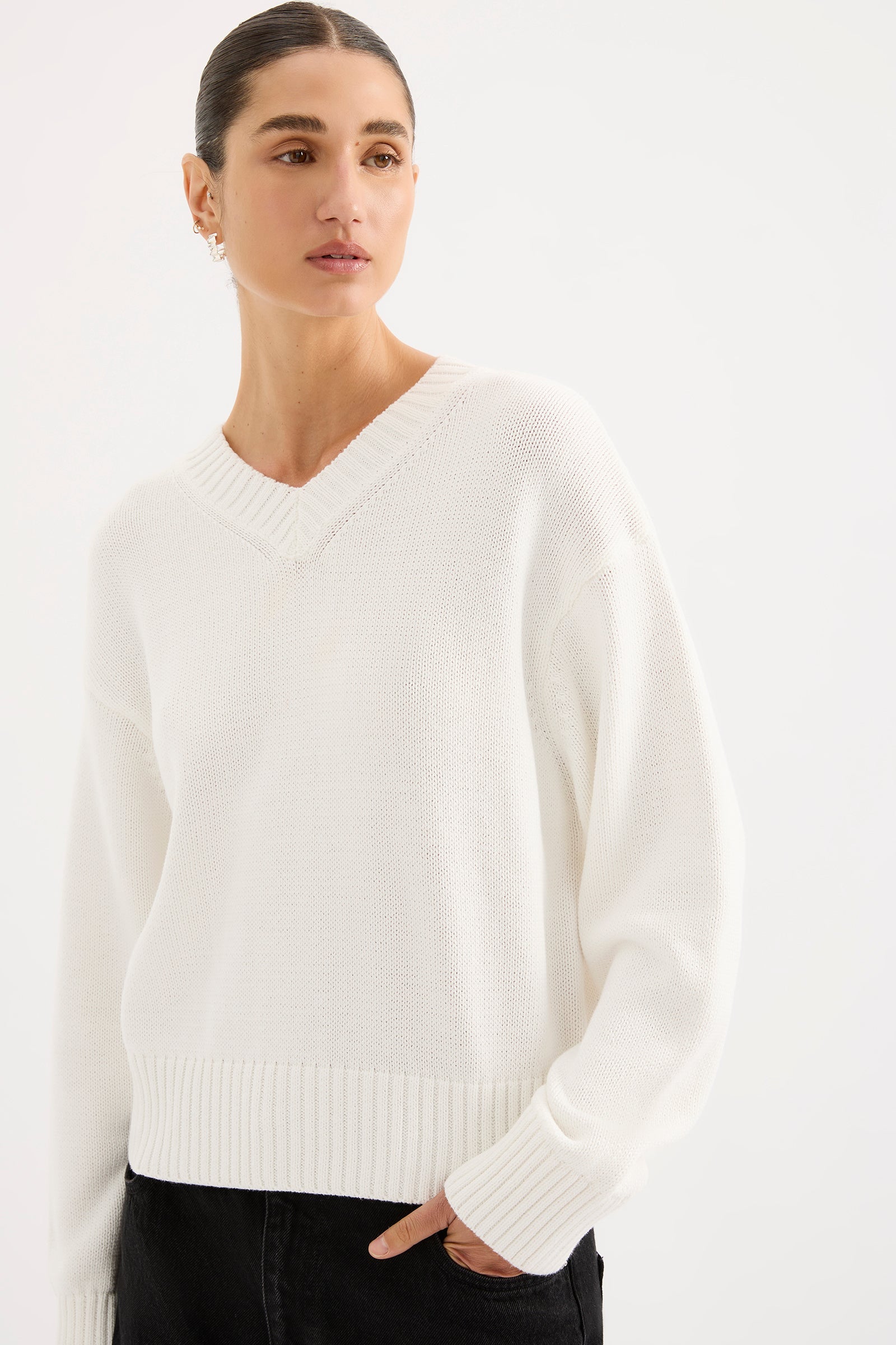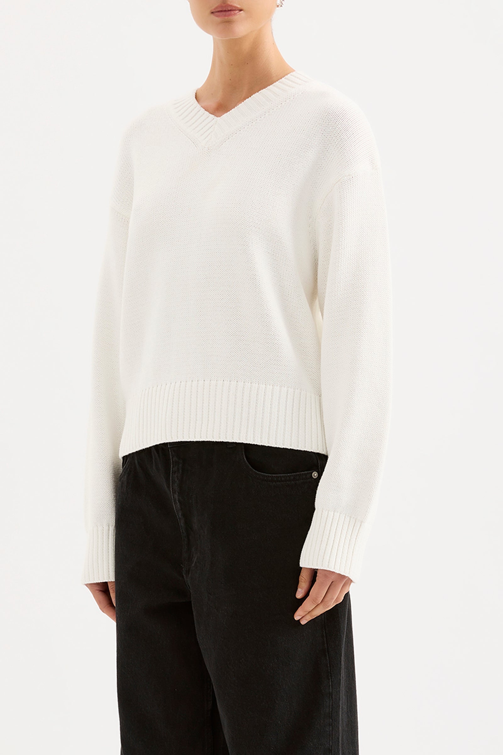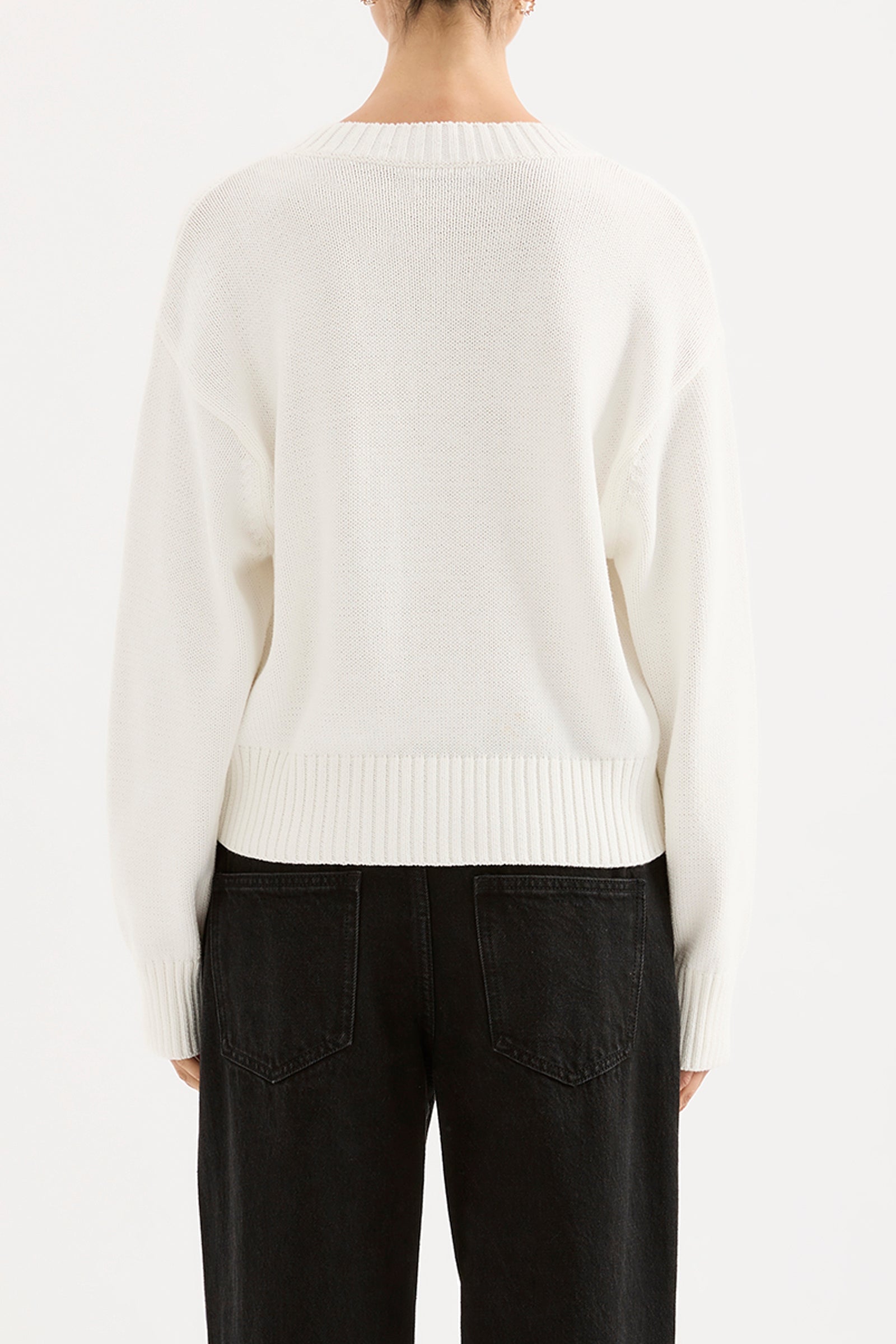 The Tara Knit is made from a midweight cotton yarn which has a solid, dry hand feel.  The silhouette is relaxed with drop shoulder and long sleeves. Features include a v-neckline and rib at neckline, hem and sleeve cuff.