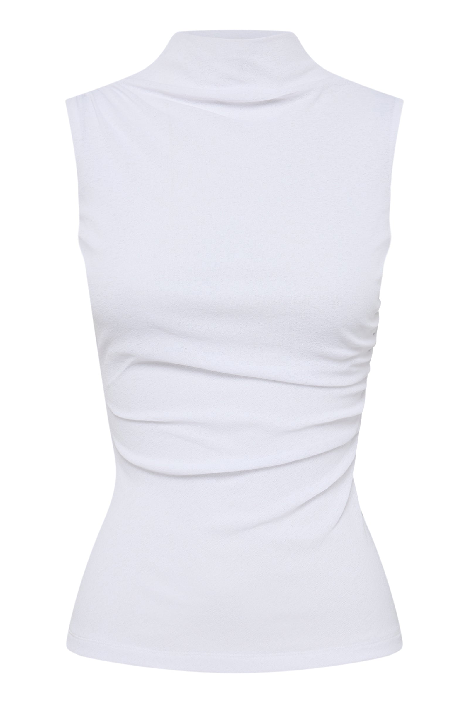 The Winston Mesh Top is made from a stretch jersey with a dry hand feel. The silhouette is a form fitting tank with length finishing at the hip. Features include a raised neckline with soft gathering detail, and asymmetric draped gathering across the body. This top is fully lined.