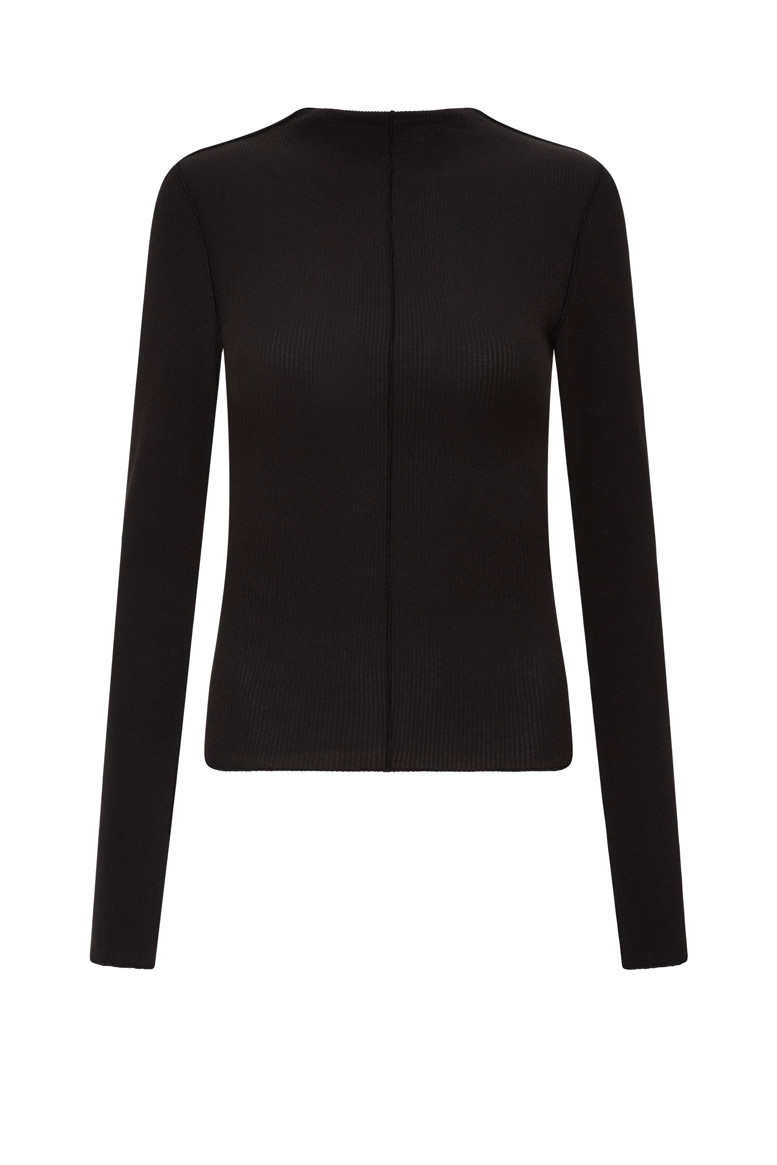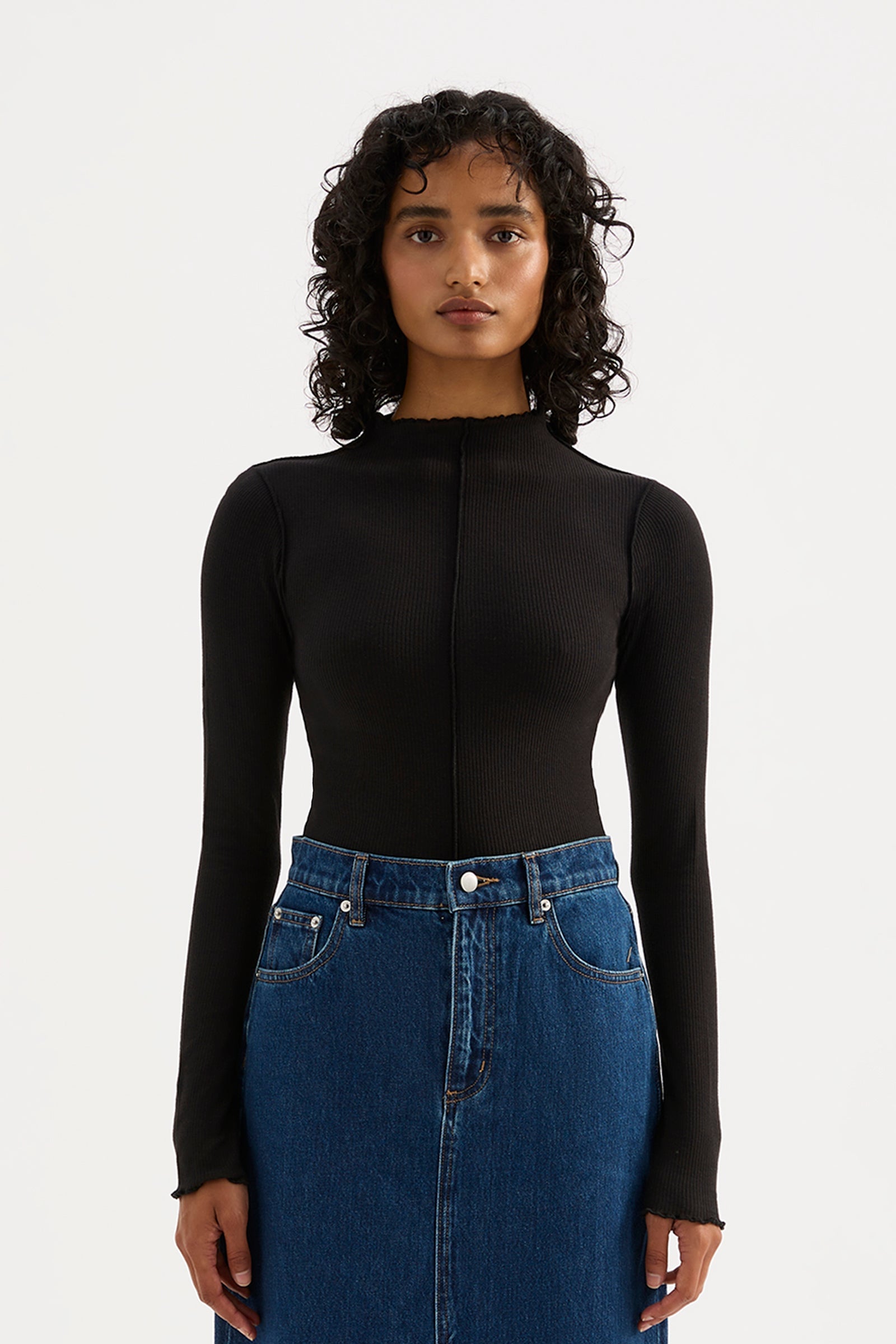 The Xavier LS Top is made in an cotton ribbed fabric which has a soft handfeel. The silhouette is a close fitting with length finishing at the hips. Features include a raised neckline, long fitted sleeves, and baby locked neckline, centre front seam and hems.