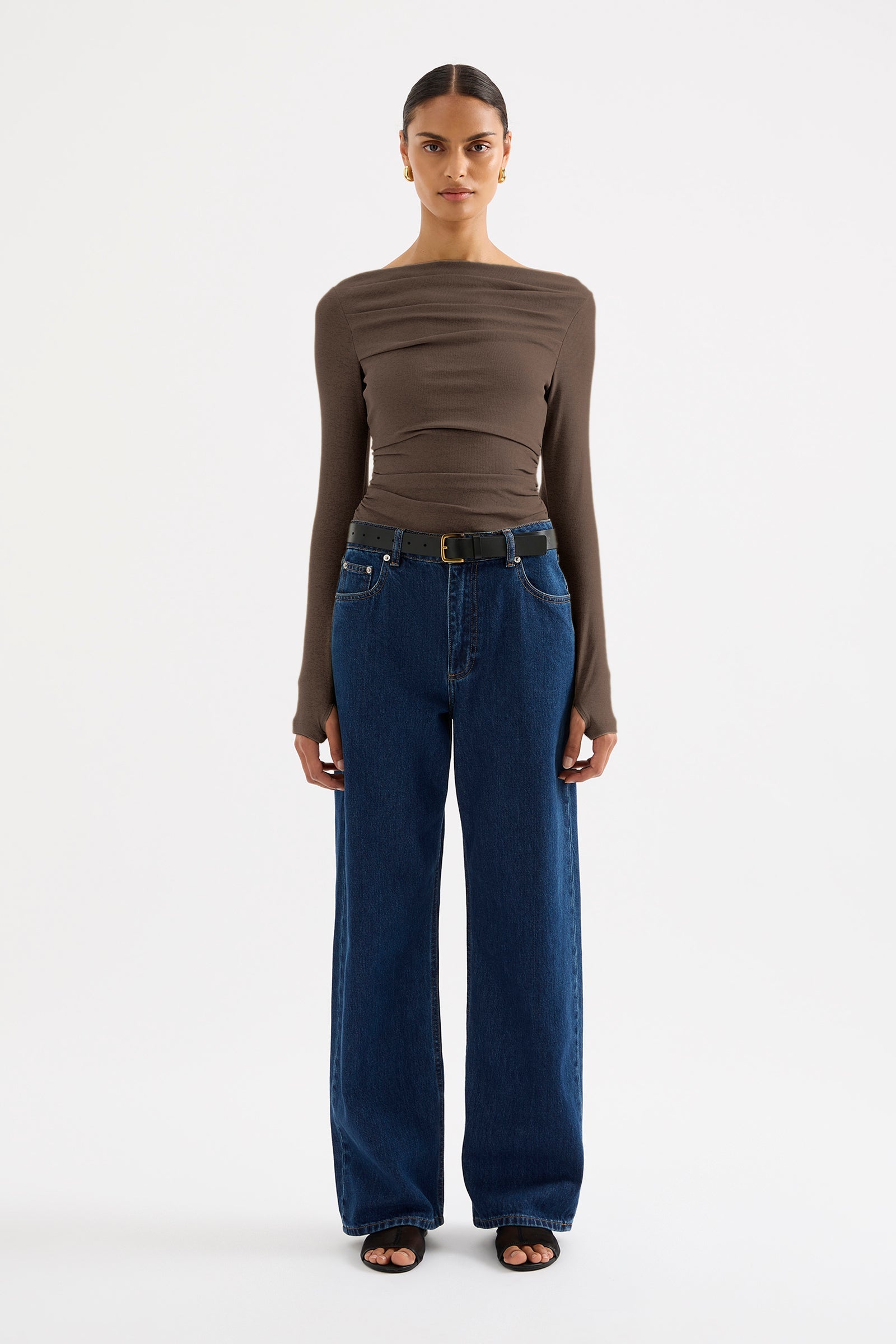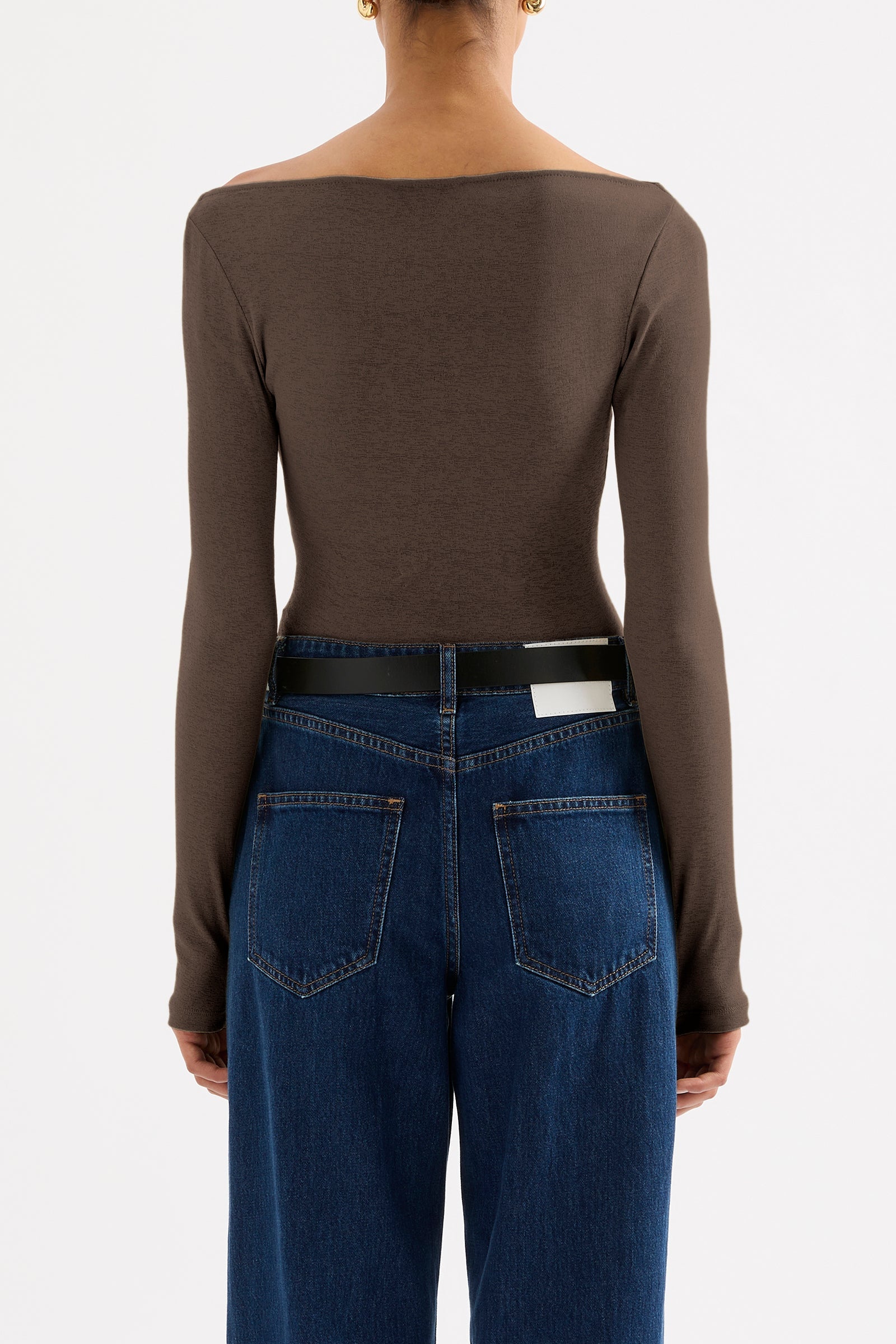 The Ziel Off Shoulder Top is made from a stretch jersey which has a dry hand feel. The silhouette is fitted with long sleeves and length finishing above the hips. Features include a high off shoulder neckline, thumbholes and organic gathering and tuck detailing.