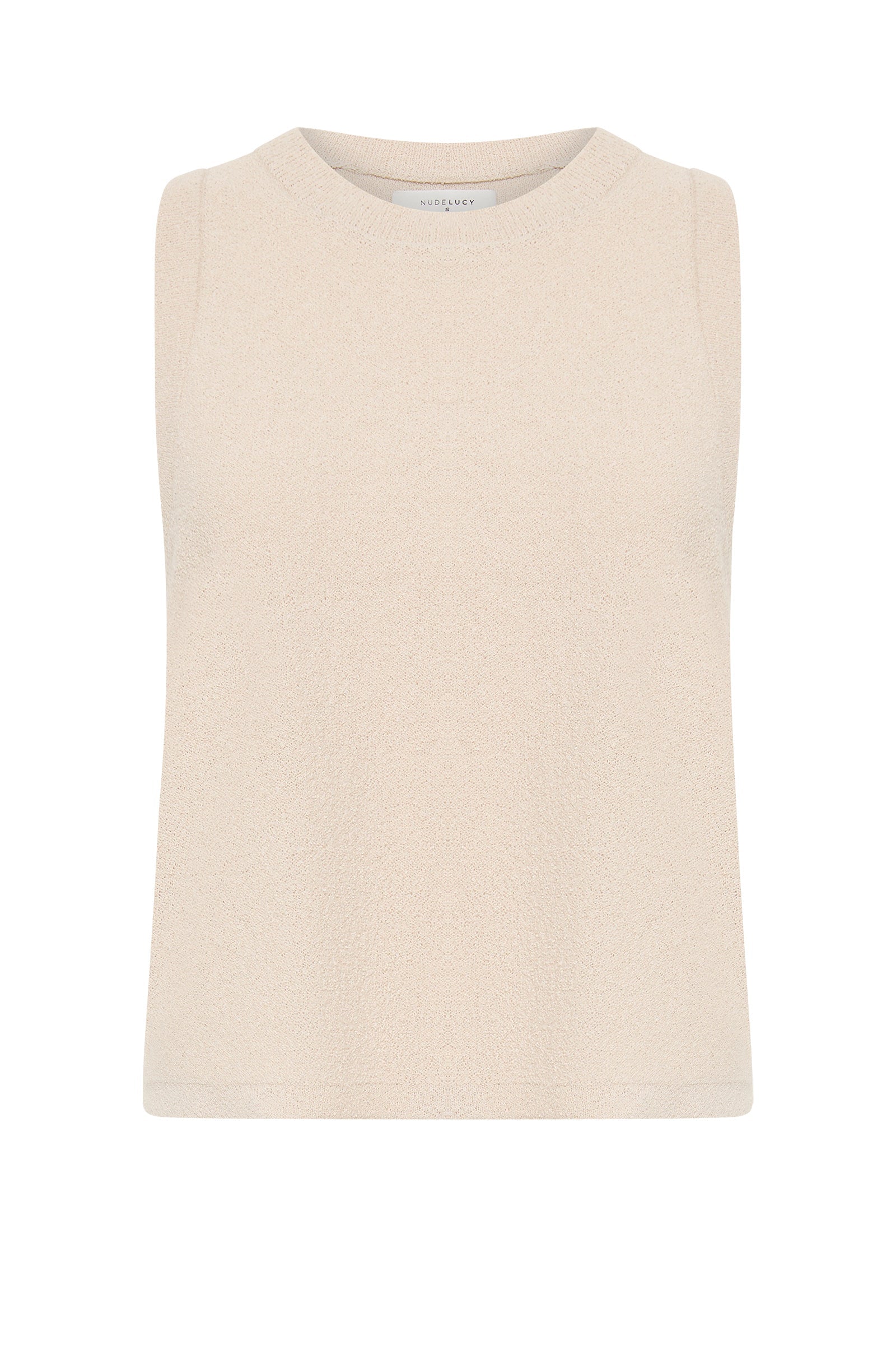 The Zosia Knit Tank in bone is made in a lightweight, textured knit with a dry hand feel. The silhouette is relaxed, with length finishing at the hips. Features include a narrow crew neckline and a stepped hem with side seam slits.