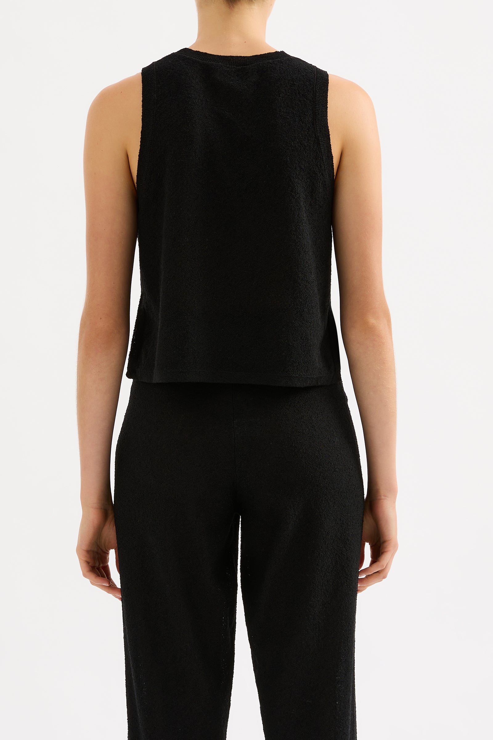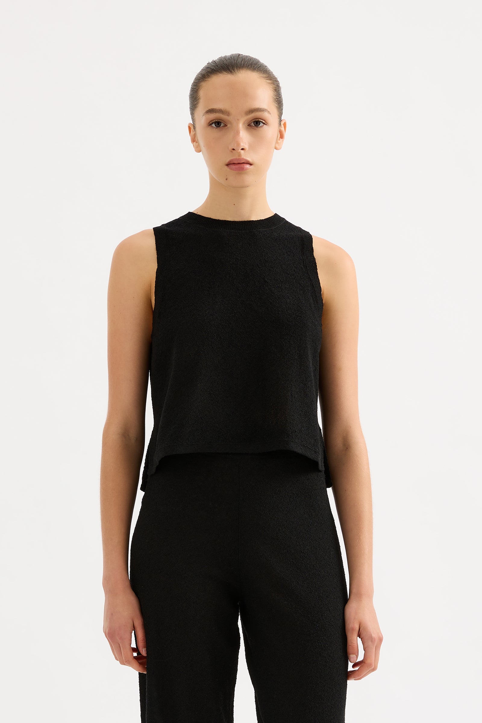 The Zosia Knit Tank in black is made in a lightweight, textured knit with a dry hand feel. The silhouette is relaxed, with length finishing at the hips. Features include a narrow crew neckline and a stepped hem with side seam slits.